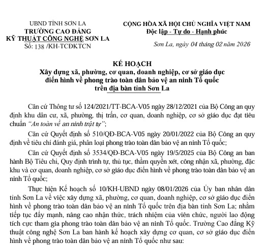 Kế hoạch tiếp công dân năm 2026 của trường Cao đẳng Kỹ thuật công nghệ Sơn La