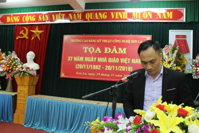 Thầy giáo Cao Minh Hà - Bí thư đảng ủy, Hiệu trưởng nhà trường Ngày 19/11 nhà trường đã tổ chức buổi tọa đàm ngày nhà giáo Việ Nam. Trong buổi Tọa đàm Thầy giáo Cao Minh Hà - Bí thư đảng ủy, Hiệu trưởng nhà trường đã gửi lời chúc đến toàn thể giáo viên, cán bộ viên chức của trường. Thầy giáo Cao Minh Hà nhấn mạnh, sự tôn vinh người thầy không chỉ được thể hiện qua truyền thống tốt đẹp của người Việt Nam với niềm tin, lòng mong muốn của toàn xã hội đối với các thầy cô giáo; đòi hỏi chúng ta thường xuyên phấn đấu, rèn luyện để hoàn thành tốt nhiệm vụ trồng người. Tuy còn nhiều khó khăn về cơ sở vật chất, tài chính nhưng tập thể Cao đẳng kỹ thuật công nghệ Sơn La vẫn một lòng tin tưởng chủ trương đường lối của Đảng và Nhà nước, luôn đoàn kết, yêu nghề, tích cực trong công tác dạy và học.