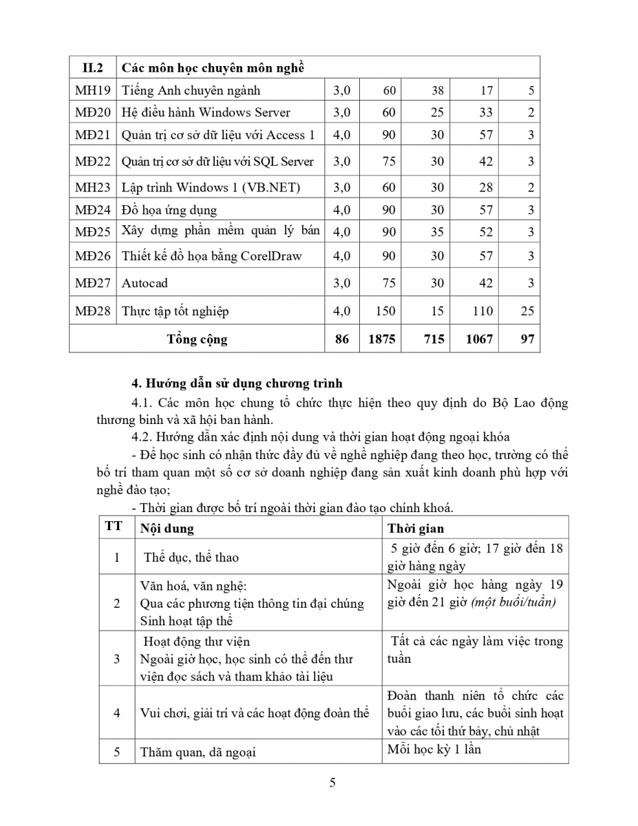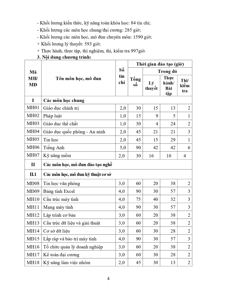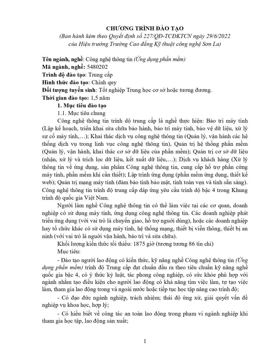 Chương trình đào tạo nghề CNTT UDPM hệ TC