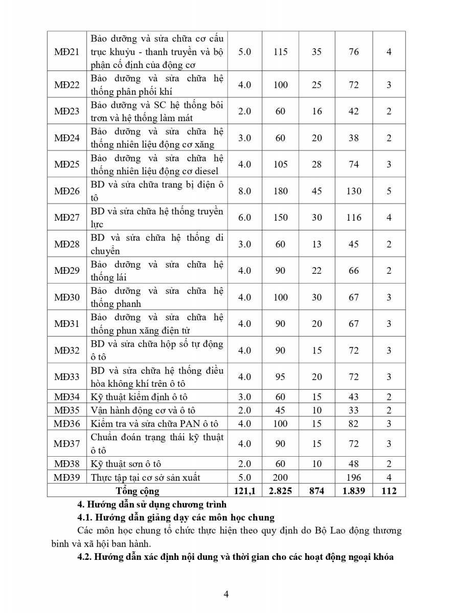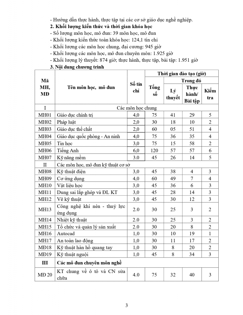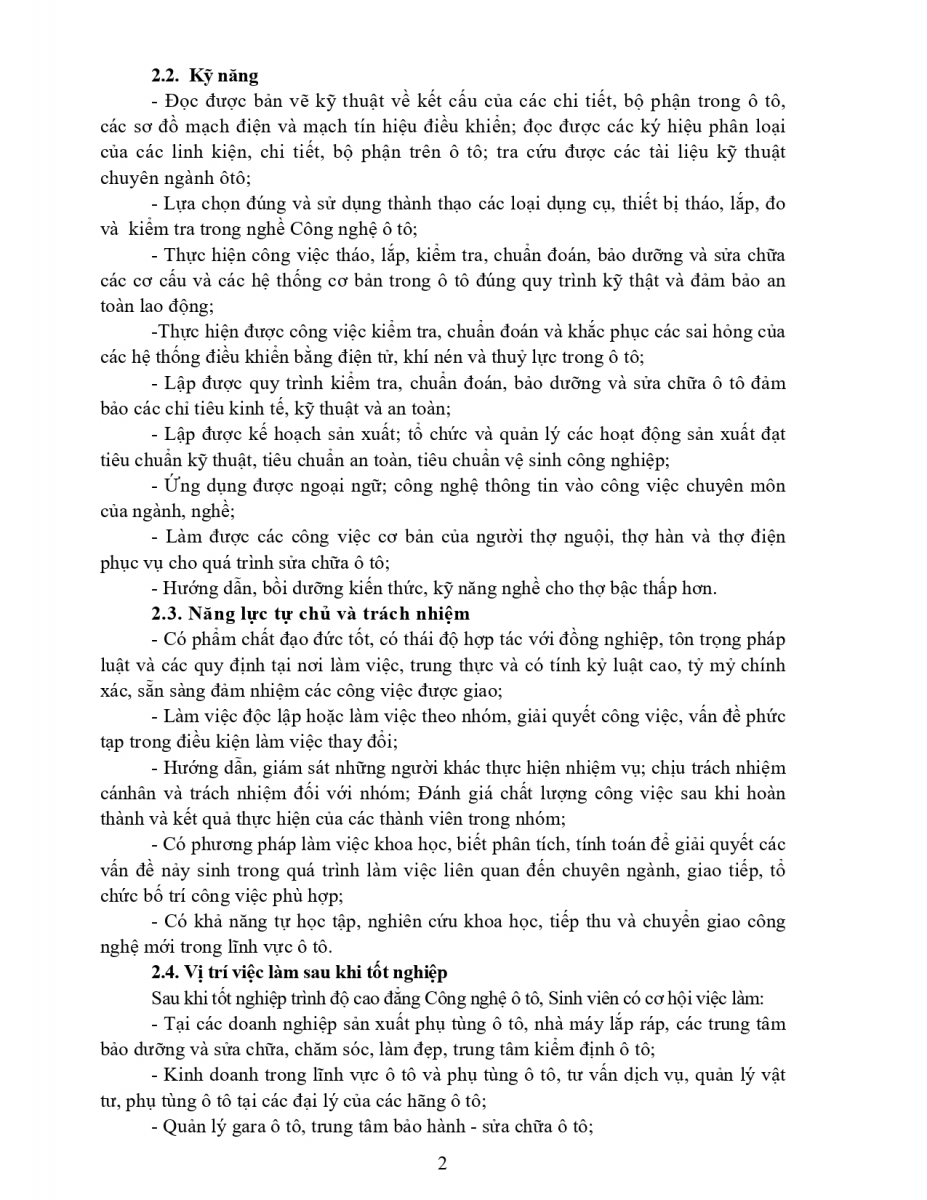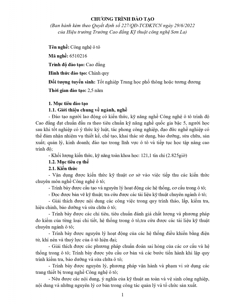 Chương trình đào tạo nghề Công nghệ Ô tô trình độ CĐ