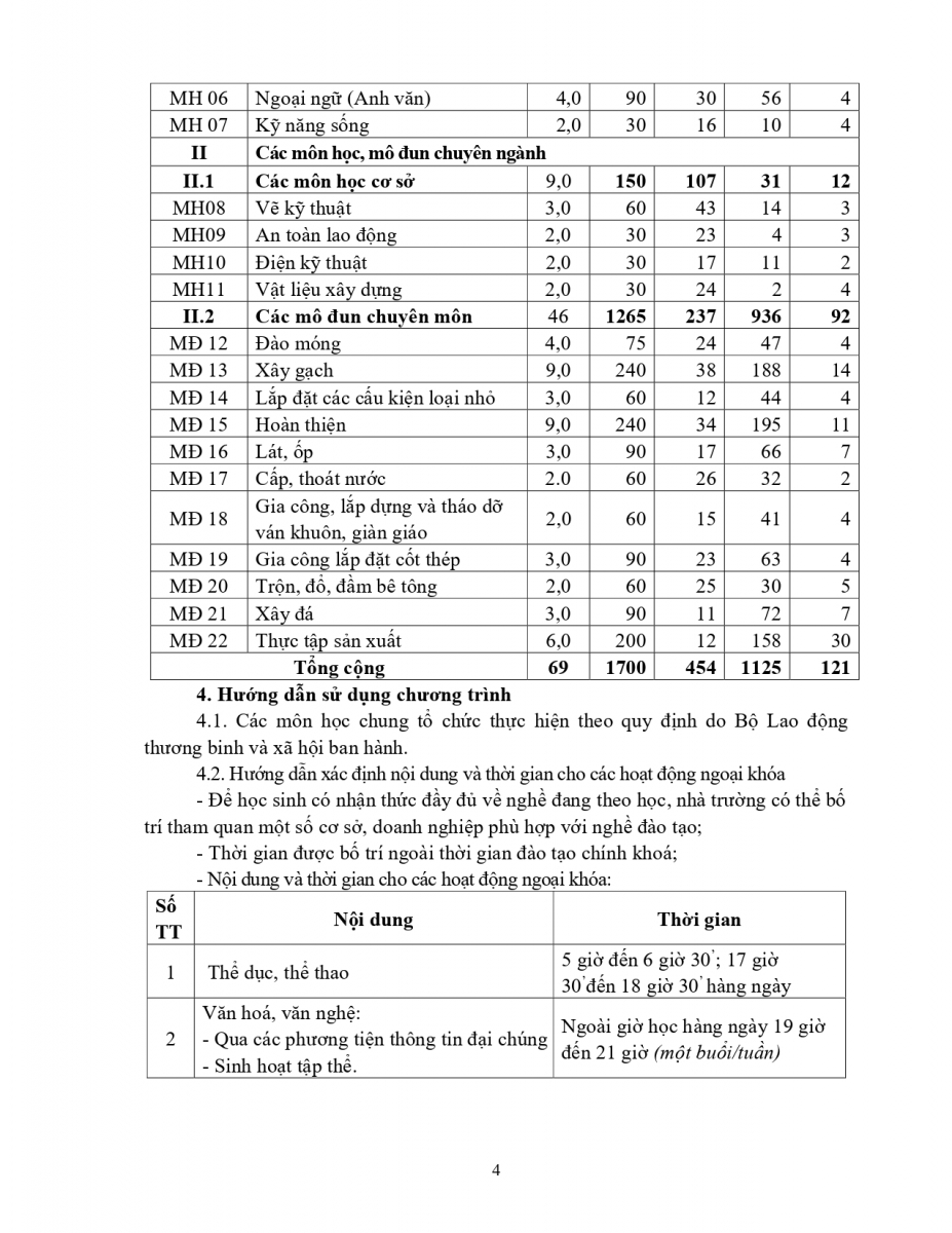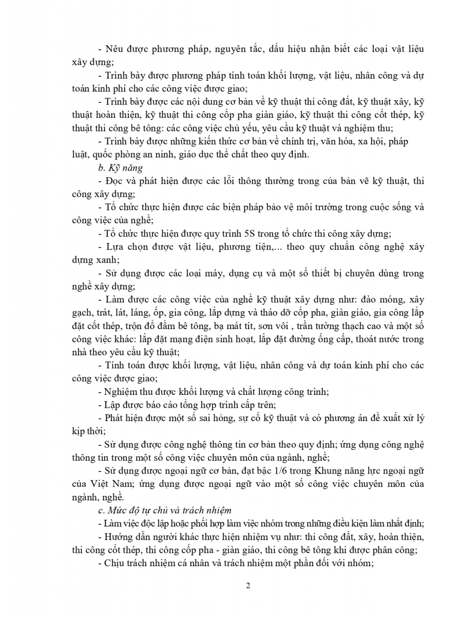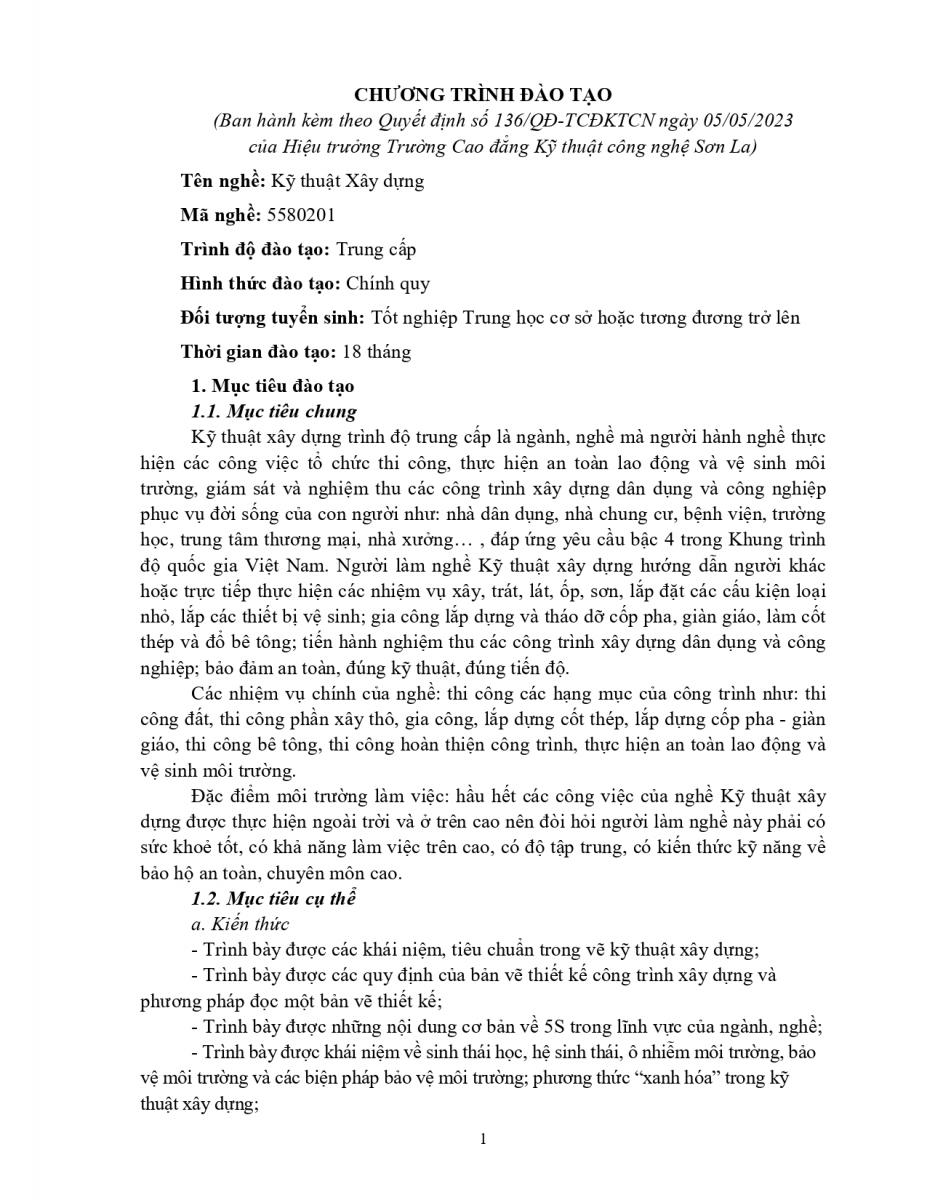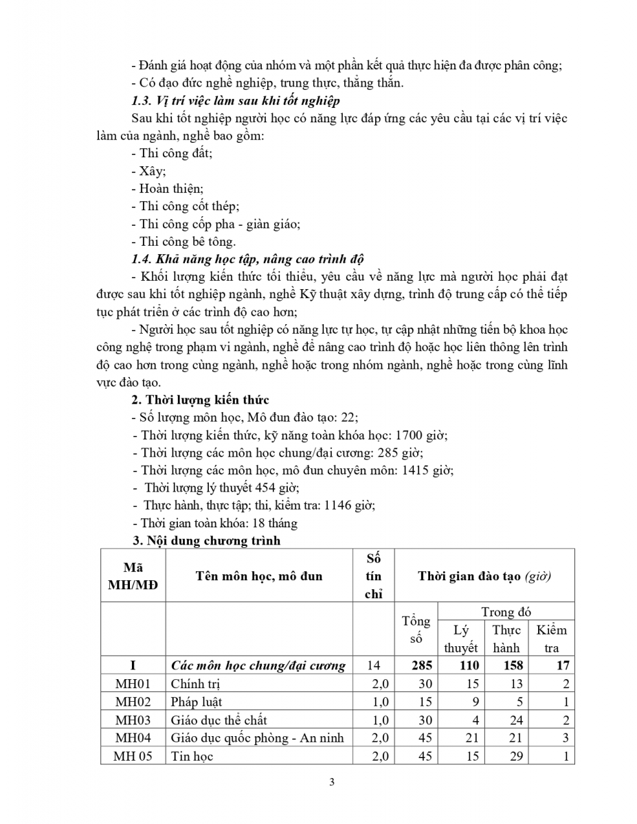 Chương trình đào tạo nghề kỹ thuật xây dựng TĐ TC