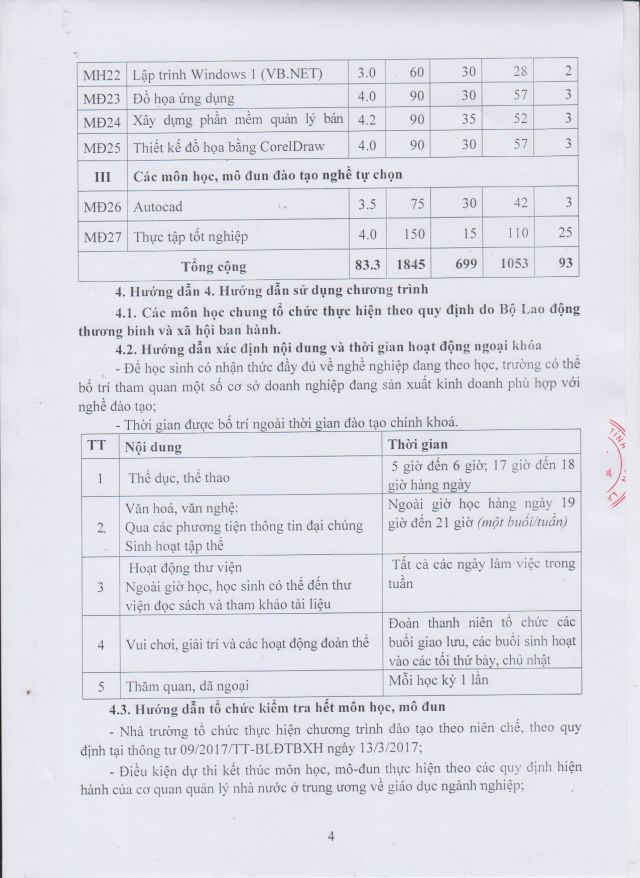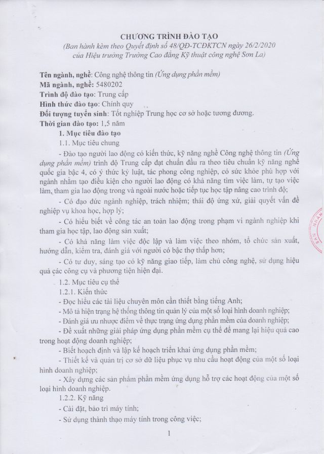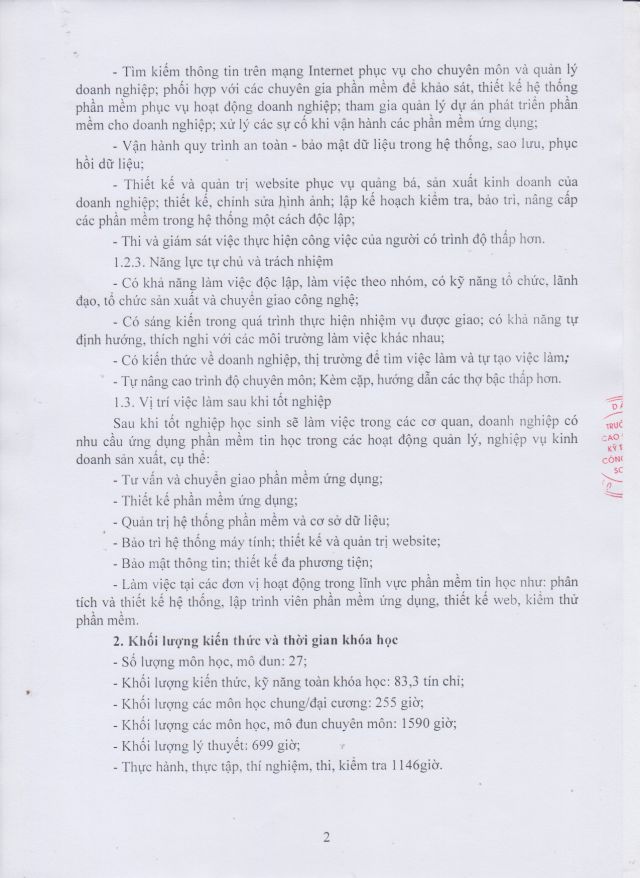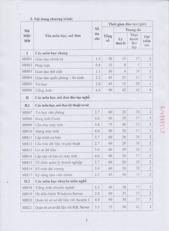 Chương trình đào tạo Trung cấp, Nghề Công nghệ thông tin (ƯDPM)