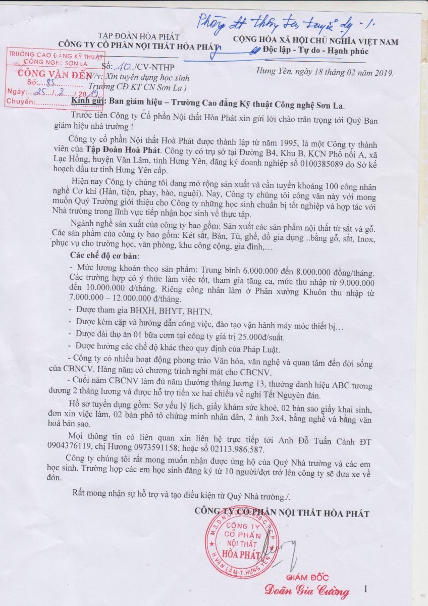 Công ty Cổ phần Nội thất Hòa Phát tuyển dụng lao động