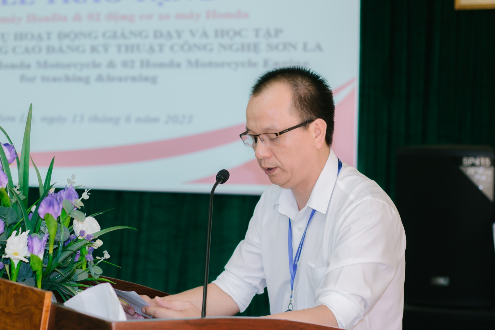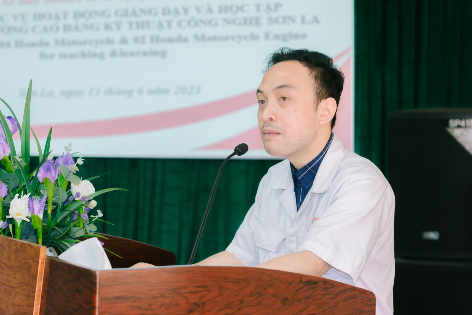 Ông Nguyễn Minh Đức, Phó trưởng Phòng nhân sự phụ trách tuyển dụng Honda Việt Nam phát biểu tai buổi lễ. Phát biểu tại buổi lễ, ông Nguyễn Minh Đức, Phó trưởng Phòng nhân sự phụ trách tuyển dụng Honda Việt Nam, cho biết: Việc trao tặng ô tô, xe máy là hoạt động hỗ trợ giáo dục tích cực, hiệu quả, với mục tiêu nhằm hỗ trợ công tác giảng dạy và học tập tại các nhà trường, nâng cao điều kiện dạy và học cho các thầy, cô giáo và học viên, góp phần đào tạo ra nguồn nhân lực chất lượng cao. Trường Cao đẳng Kỹ thuật Công nghệ Sơn La là cơ sở GDNN đầu tiên trên địa bàn tỉnh Sơn La công ty Honda Việt Nam trao tặng thiết bị đào tạo, Công ty mong muốn tiếp tục có sự hợp tác hiệu quả với Nhà trường trên các lĩnh vực, đặc biệt trong công tác nâng cao chất lượng đào tạo và giải quyết việc làm sau đào tạo