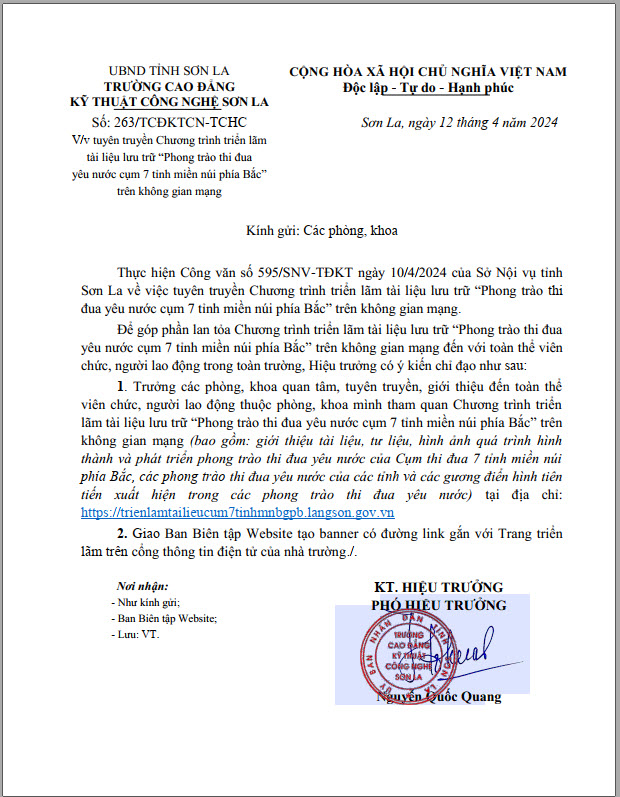 Công văn 263 tuyên truyền chương trình triển lãm tài liệu lưu trữ "Phong trào thi đua yêu nước cụm 7 tỉnh miền núi phía bắc"