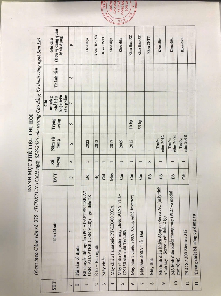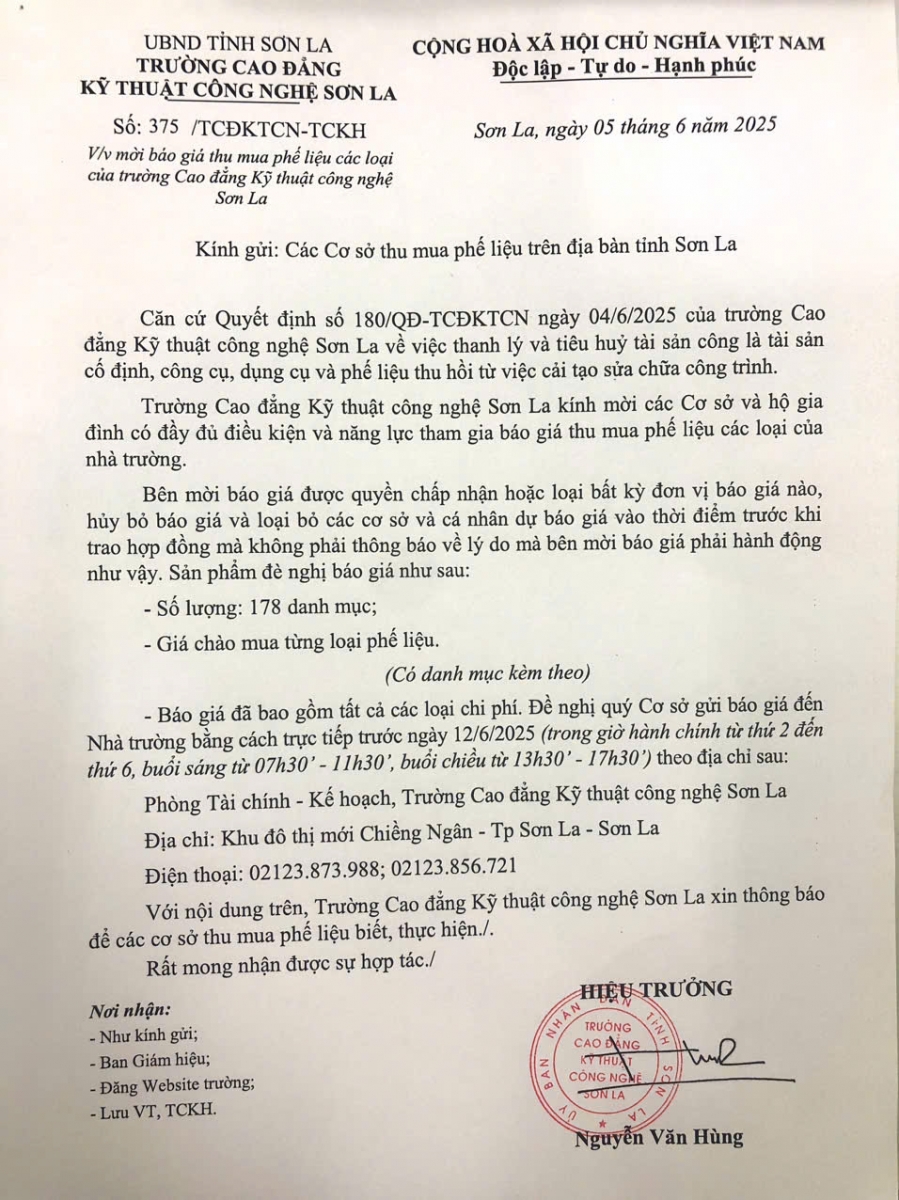 Công văn mời báo giá thu mua phế liệu các loại của trường Cao đẳng Kỹ thuật công nghệ Sơn La