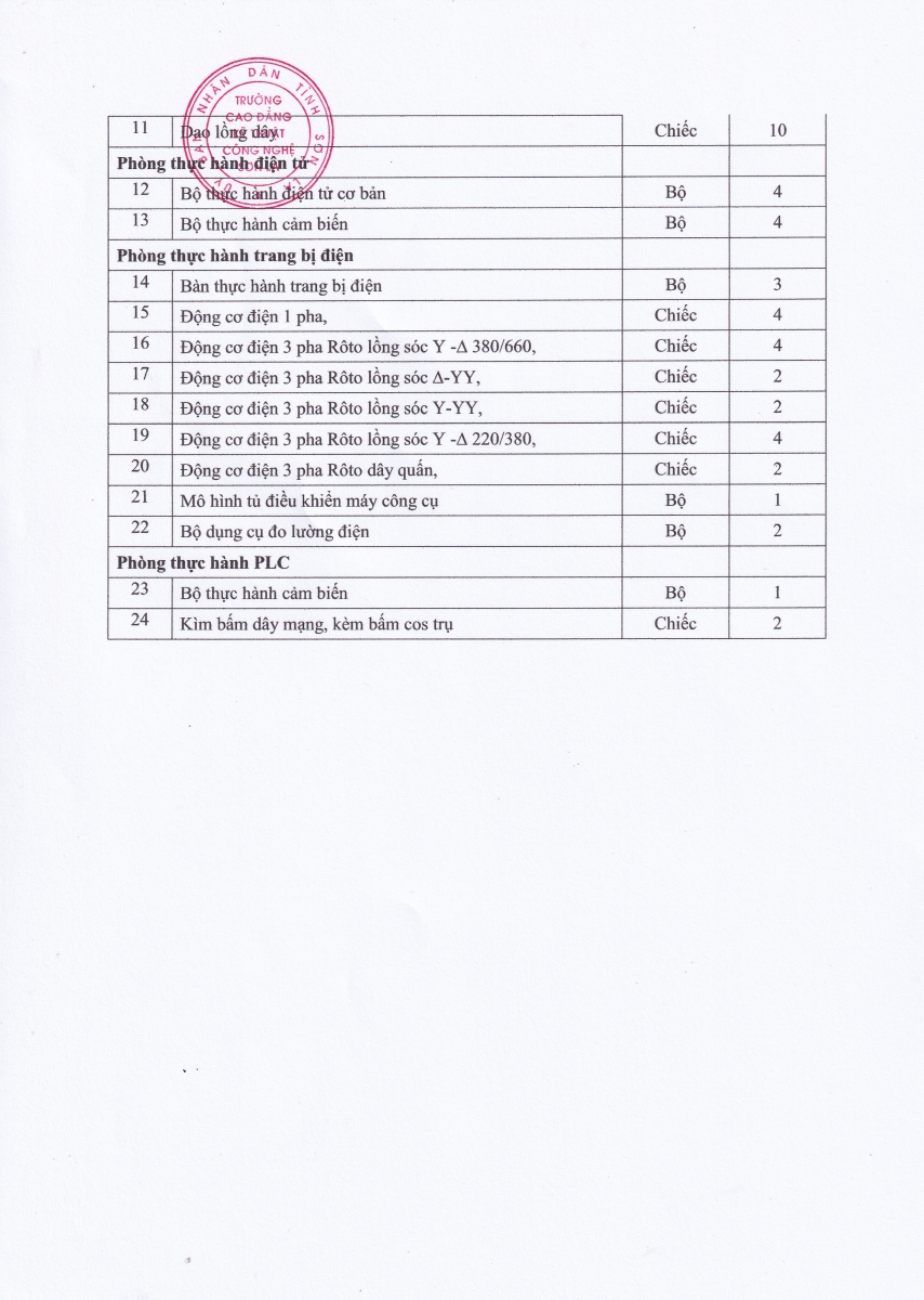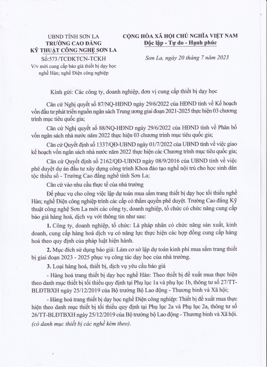 Công văn mời cung cấp báo giá thiết bị dạy học nghề Hàn, nghề Điện công nghiệp
