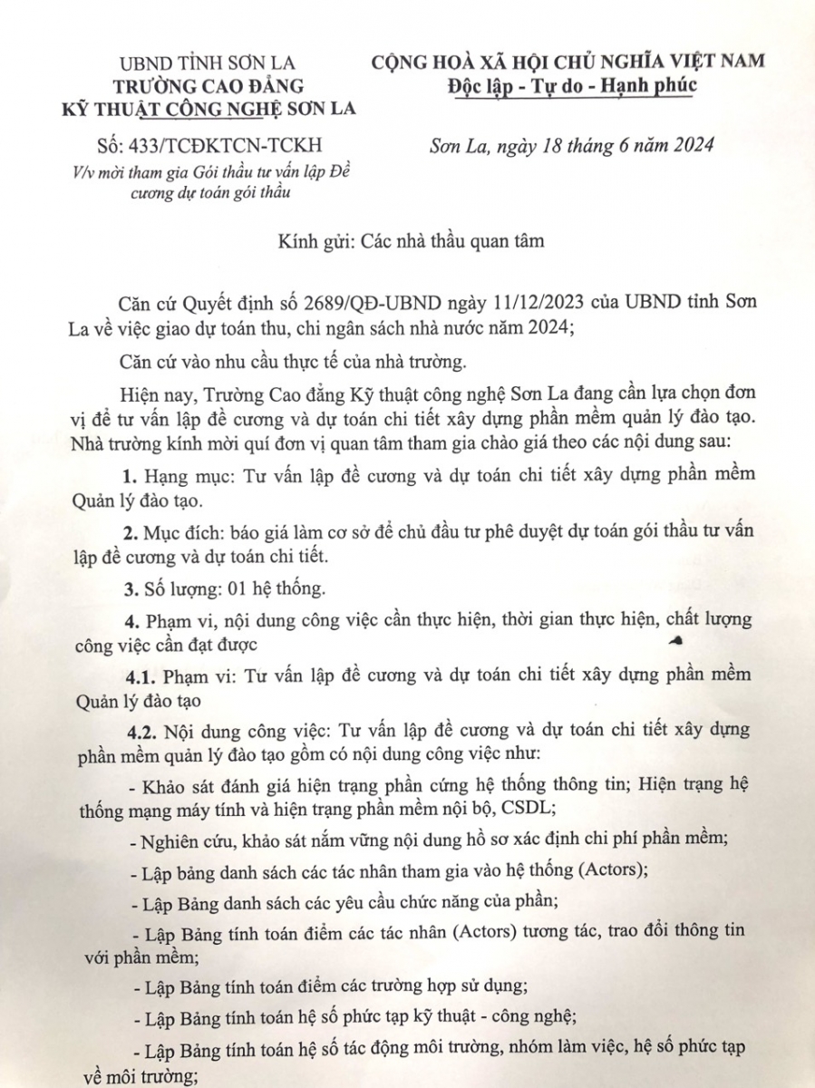 Công văn mời tham gia gói thầu tư vấn lập đề cương dự toán gói thầu_Xây dựng phần mềm quản lý đào tạo
