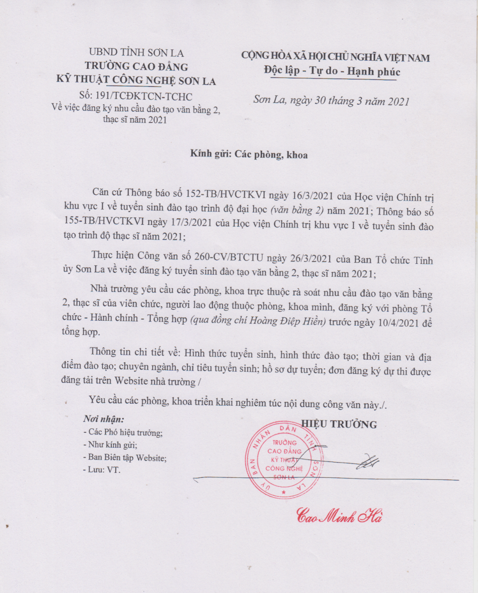 Công văn số 191/TCĐKTCN-TCHC ngày 30/3/2021 về việc đăng ký nhu cầu đào tạo văn bằng 2, thạc sĩ năm 2021