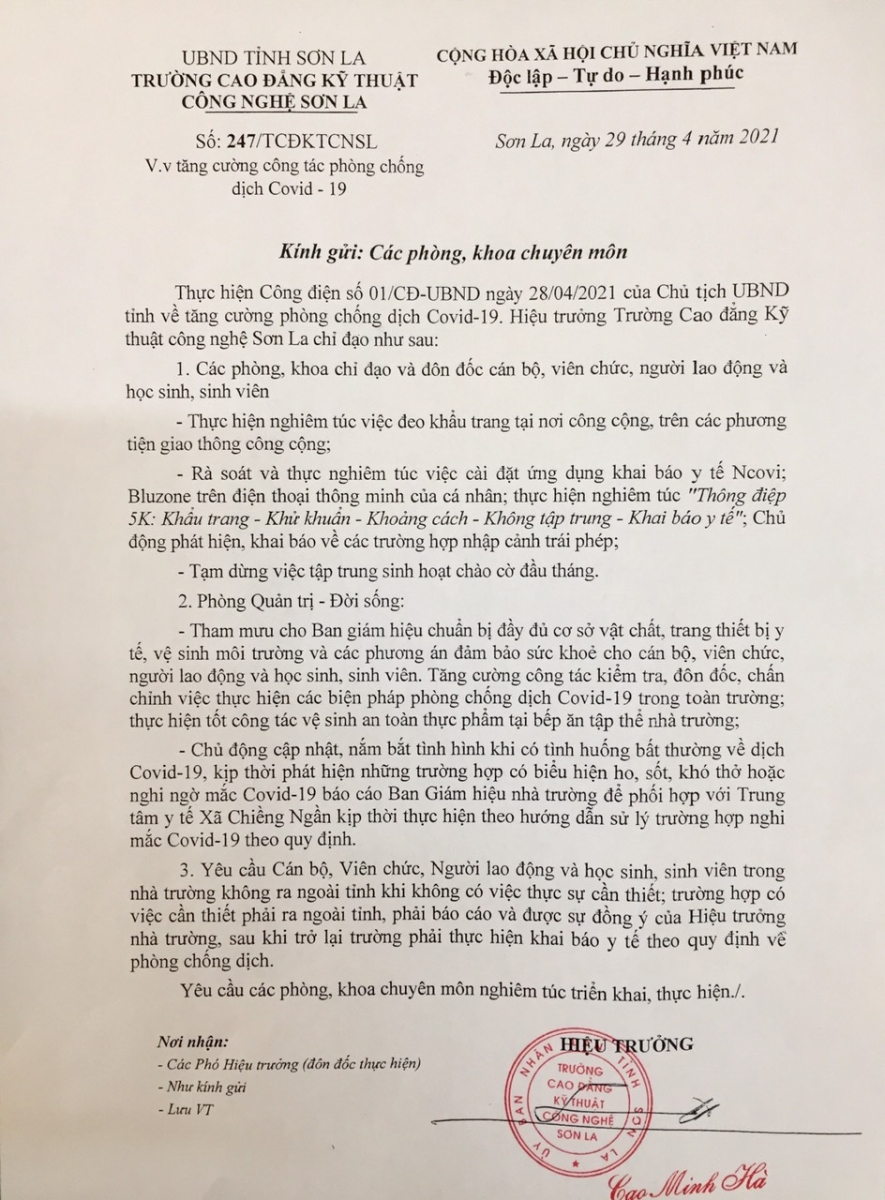 » Kế hoạch số 288/KH-CĐKTCNSL ngày 24/5/2021 về việc thực hiện các biện pháp phòng, chống dịch bệnh Covid - 19 (25.05.2021)