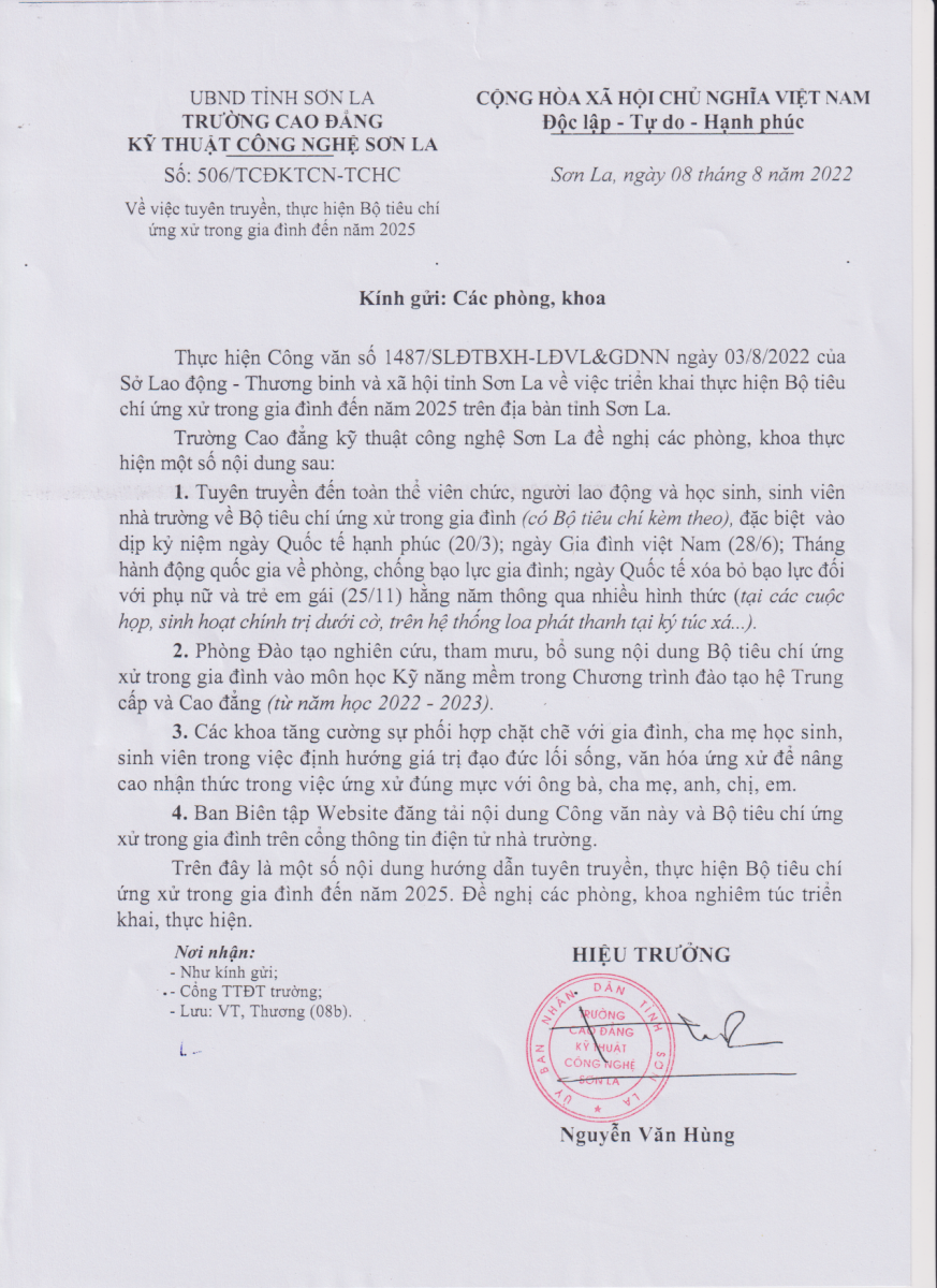 Công văn số 506/TCĐKTCN ngày 08/8/2022 về việc tuyên truyền, thực hiện Bộ tiêu chí ứng xử trong gia đình đến năm 2025