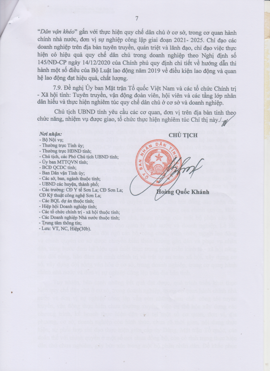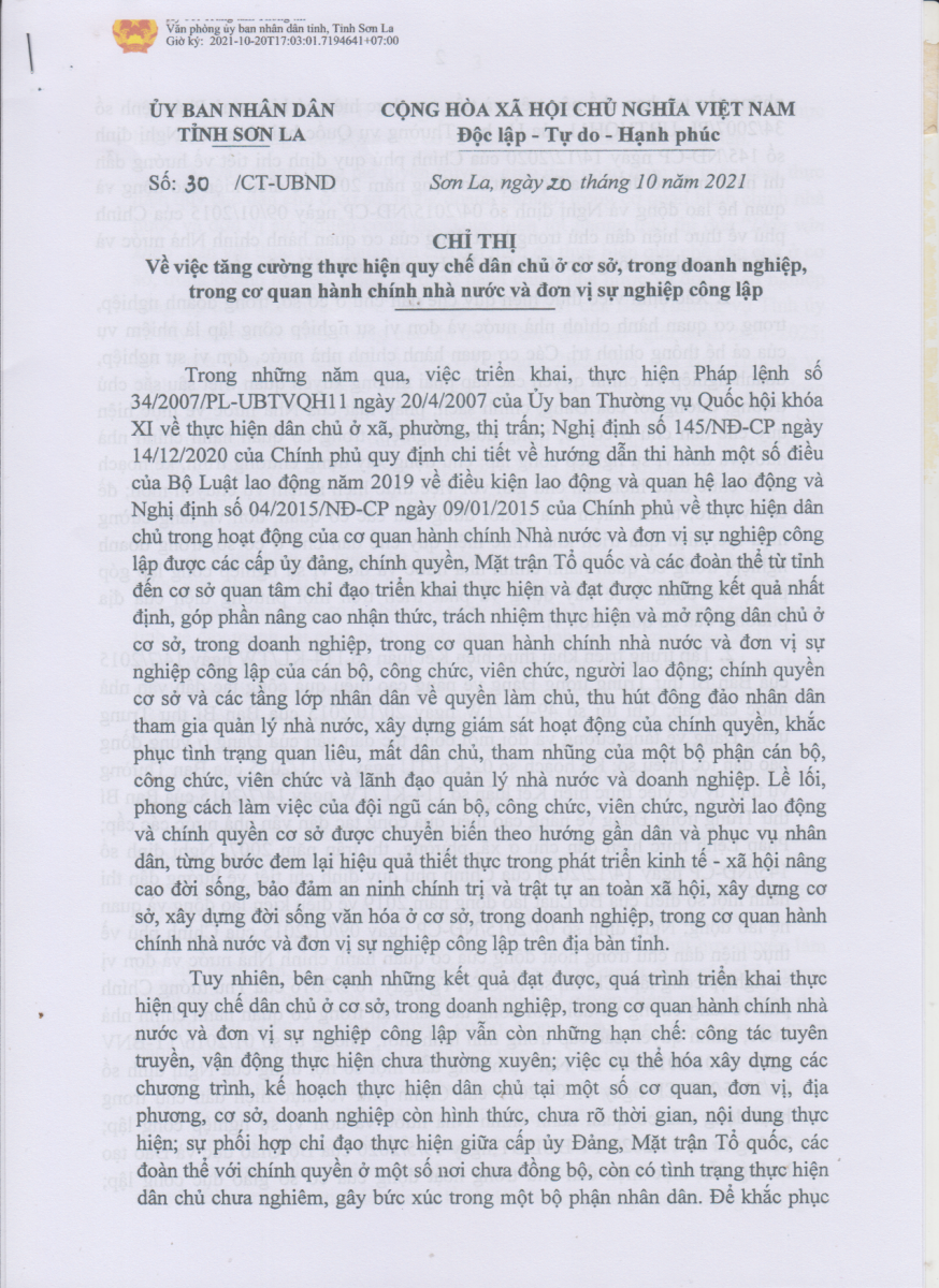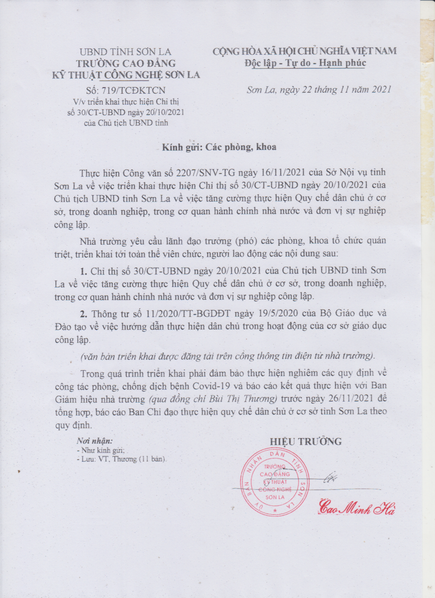 Công văn số 719/TCĐKTCN ngày 22/11/2021 về việc triển khai thực hiện Chỉ thị số 30 của Chủ tịch UBND tỉnh Sơn La về tăng cường thực hiện QUy chế dân chủ ơ cơ sở