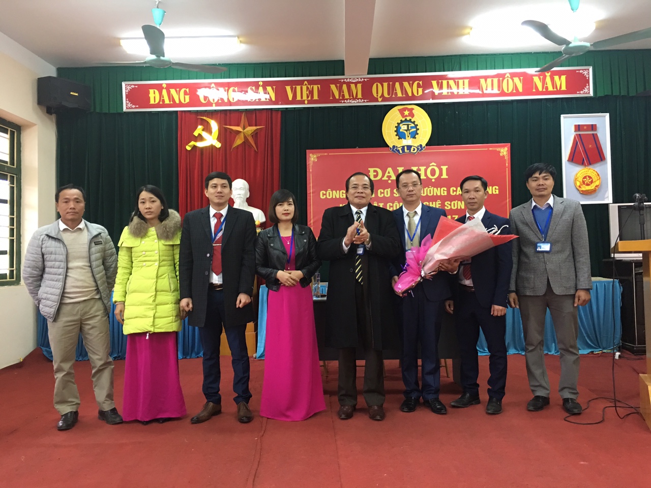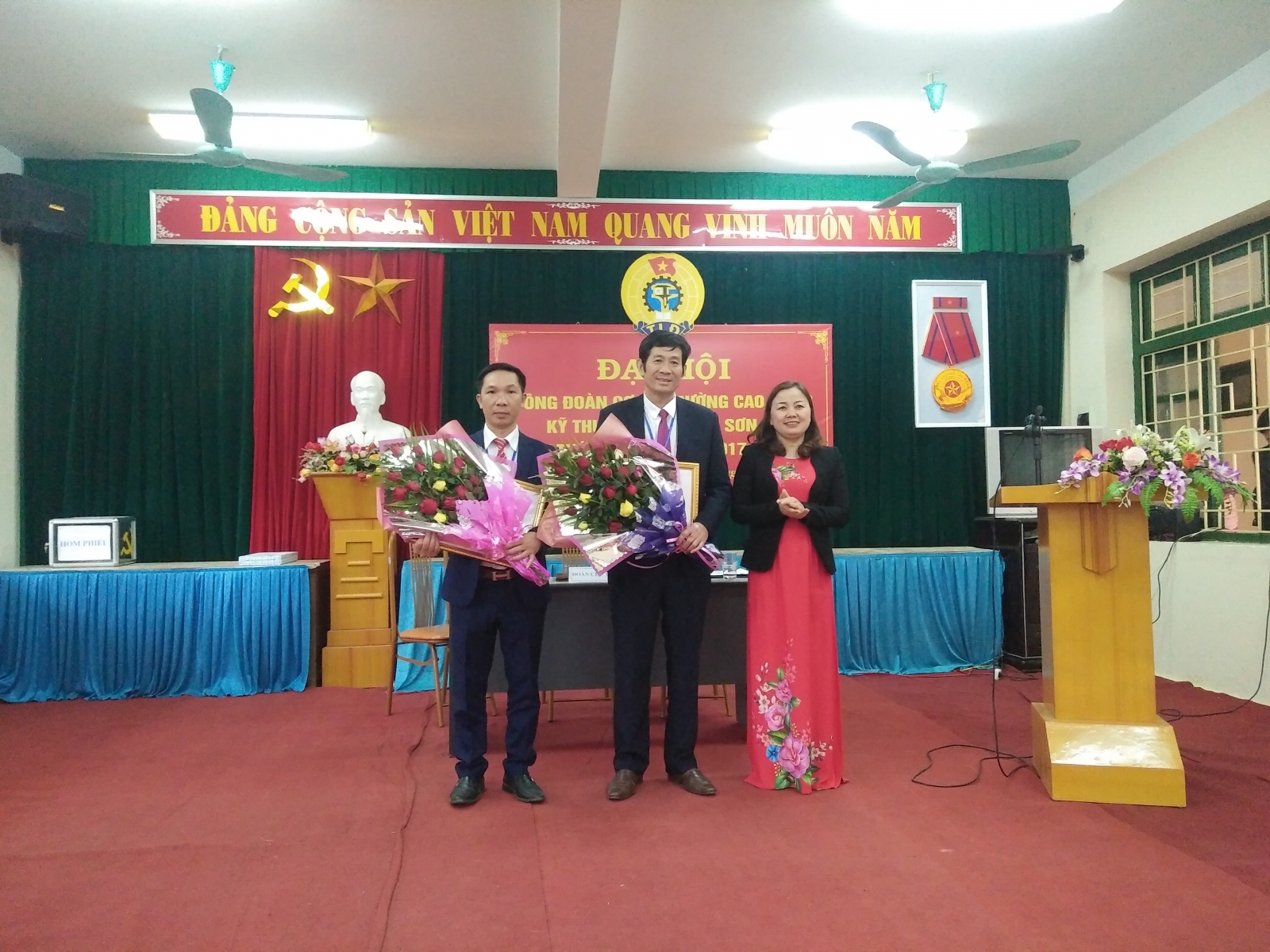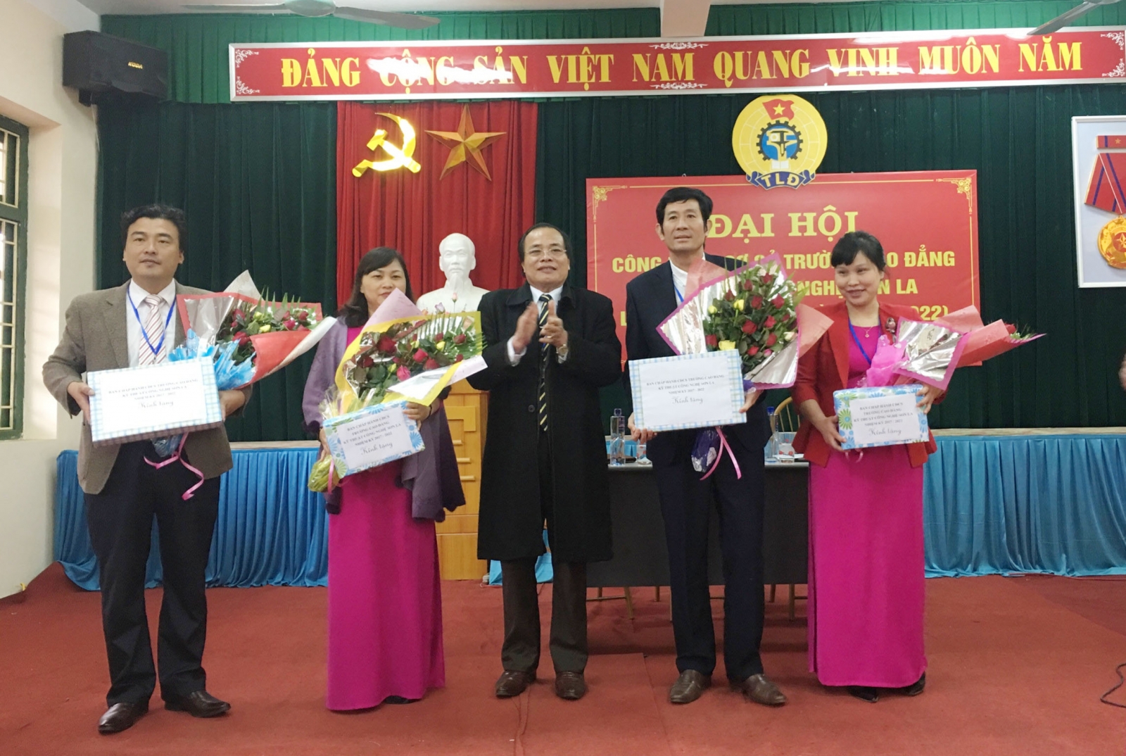 Đ/c Cao Minh Hà tặng hoa chúc mừng các đồng chí trong BCH nhiệm kỳ 2012 – 2017 thôi không tham gia BCH nhiệm kỳ 2017 - 2022. Để ghi nhận những thành tích các đồng chí Đoàn viên công đoàn nhà trường đã có nhiều cố gắng trong công tác hoạt động công đoàn nhiệm kỳ 2012 – 2017, BCH Liên đoàn lao động Tỉnh đã tặng Bằng khen của BCH cho tập thể Công đoàn nhà trường và 01 cá nhân; BCH công đoàn cơ sở nhà trường đã tặng giấy khen cho 11 đồng chí.