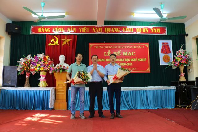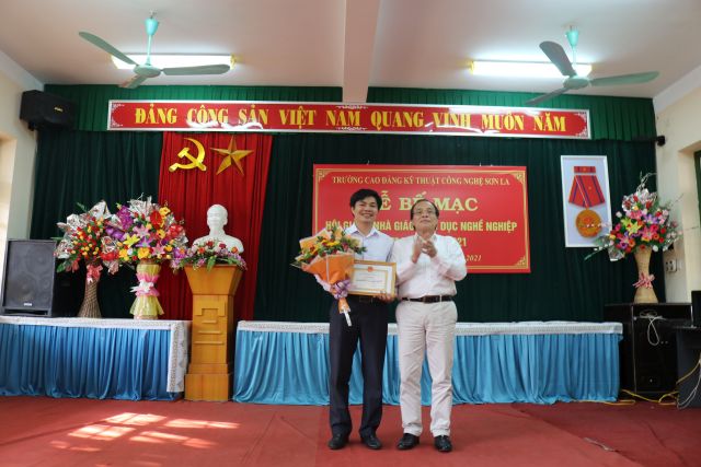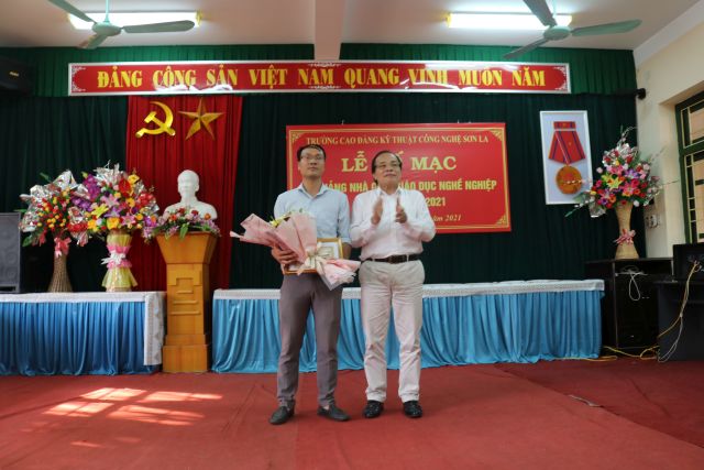 Đồng chí Cao Minh Hà Bí thư đảng ủy - Hiệu trưởng nhà trường trao giấy chứng nhận giáo viên dạy giỏi Giải nhất: Giảng viên Nguyễn Quang Minh - Khoa Cơ khí Động lực