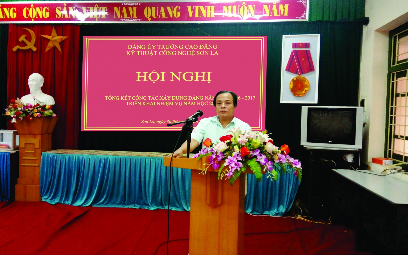 Đồng chí Cao Minh Hà - Bí Thư Đảng ủy phát biểu tại Hội nghị Mở đầu Hội nghị, Đồng chí Cao Minh Hà - Bí Thư Đảng ủy đã trình bày Dự thảo Báo cáo tổng kết công tác xây dựng đảng năm học 2016 – 2017 và phương hướng nhiệm vụ công tác xây dựng đảng năm học 2017 – 2018. Năm học 2016 - 2017 Đảng bộ nhà trường có nhiệm vụ chính là: Lãnh đạo nhà trường tiếp tục thực hiện Nghị quyết Đại hội Đảng các cấp; đào tạo nguồn nhân lực kỹ thuật ở 3 cấp trình độ cao đẳng nghề, trung cấp nghề và sơ cấp nghề; tiếp tục triển khai thực hiện dự án nghề trọng điểm quốc gia; kiểm điểm tự phê bình và phê bình theo tinh thần nghịquyết hội nghị lần thứ 4 Ban chấp hành Trung ương Đảng khóa XII về tăng cường xây dựng, chỉnh đốn Đảng; ngăn chặn, đẩy lùi sự suy thoái về tư tưởng chính trị, đạo đức, lối sống, những biểu hiện "tự diễn biến", "tự chuyển hóa" trong nội bộ gắn với học tập và làm theo tấm gương đạo đức, phong cách Hồ Chí Minh; lãnh đạo các tổ chức đoàn thể đẩy mạnh các phong trào thi đua trong nhà trường. Trong năm học 2016 - 2017 Đảng bộ Trường Cao đẳng Kỹ thuật Công nghệ Sơn La tiếp tục đạt được nhiều thành tựu quan trọng, toàn diện trên tất cả các lĩnh vực: cơ cấu tổ chức được sắp xếp hợp lý; công tác cán bộ đi vào nền nếp; công tác đào tạo ổn định về quy mô và chất lượng; hoạt động nghiên cứu khoa học, ứng dụng và chuyển giao công nghệ có hiệu quả; hoạt động hợp tác quốc tế được tăng cường; cơ sở vật chất, tài chính phát triển lành mạnh, minh bạch; đời sống vật chất và tinh thần của cán bộ, đảng viên, học sinh, sinh viên được nâng cao; an ninh, trật tự và an toàn trong Nhà trường được đảm bảo. Công tác xây dựng Đảng được quan tâm đúng mức, nội bộ Nhà trường đoàn kết thống nhất; cán bộ, học sinh, sinh viên đồng thuận, triển khai đầy đủ và kịp thời các chủ trương, nghị quyết của cấp ủy cấp trên.