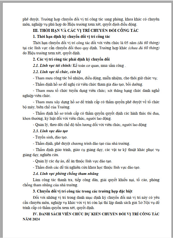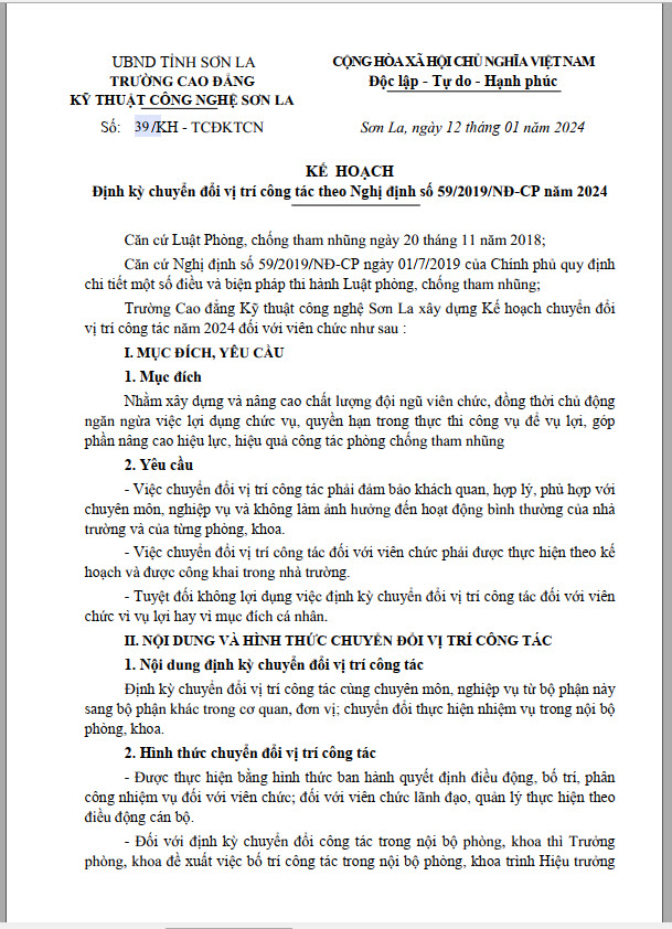 Kế hoạch 39 Định kỳ chuyển đổi vị trí công tác theo nghị định 59