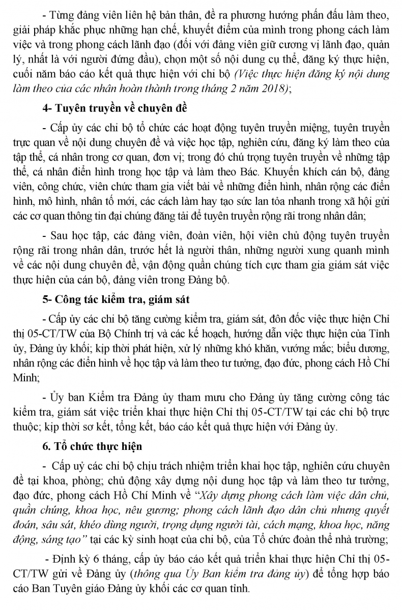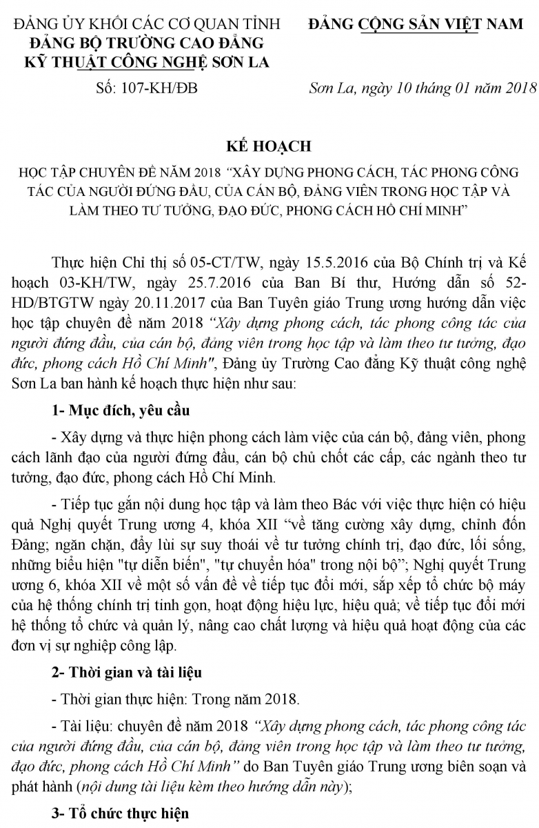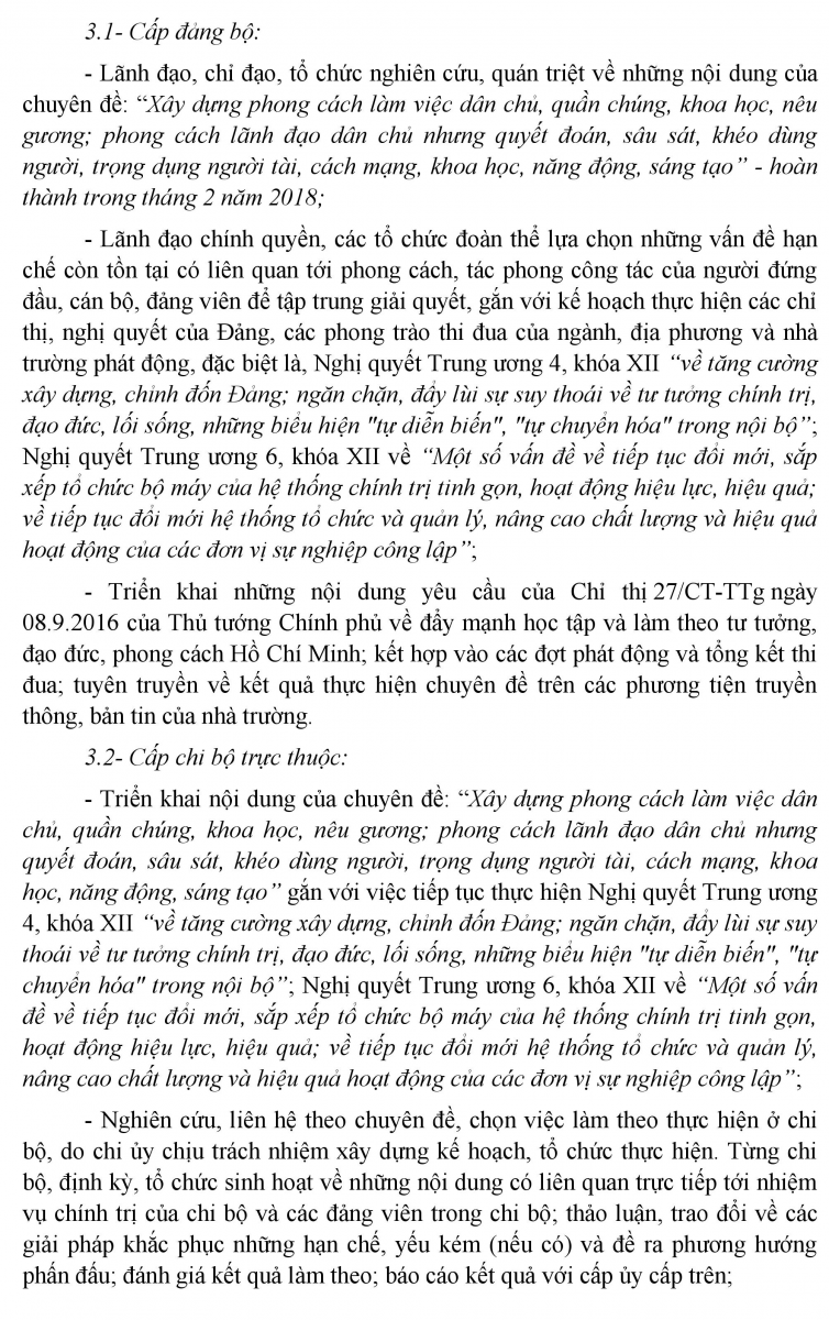 Kế hoạch học tập chuyên đề năm 2018 ''HỌC TẬP CHUYÊN ĐỀ NĂM 2018 “XÂY DỰNG PHONG CÁCH, TÁC PHONG CÔNG TÁC CỦA NGƯỜI ĐỨNG ĐẦU, CỦA CÁN BỘ, ĐẢNG VIÊN TRONG HỌC TẬP VÀ LÀM THEO TƯ TƯỞNG, ĐẠO Đ.