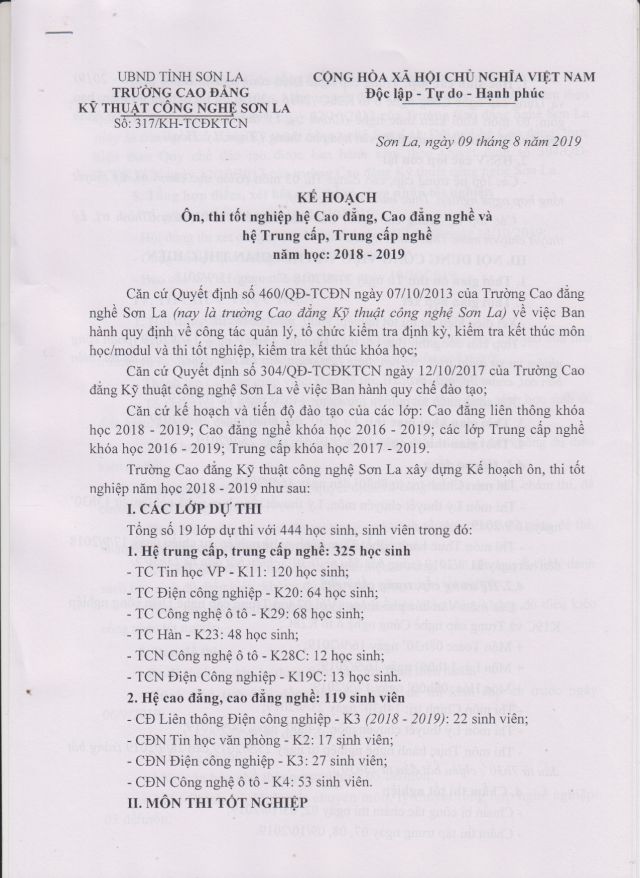 » Tuyên truyền và lấy ý kiến góp ý dự thảo Bộ Luật lao động (sửa đổi) (02.08.2019 ) » Thông báo tuyển sinh năm học 2019 - 2020 (04.05.2019 ) » Kết quả tốt nghiệp, hệ trung cầp nghề kỹ thuật xây dựng K37 (03.05.2019 ) » Chính sách chất lượng của Trường Cao đẳng Kỹ thuật công nghệ Sơn La (21.12.2018 ) » Phiếu đăng ký xét tuyển năm 2018 (07.07.2018 ) » Thông báo tuyển sinh năm học 2018 - 2019 (06.06.2018 ) » Kết quả tốt nghiệp hệ trung cấp nghề kỹ thuật xây dựng K36 (06.06.2018 ) » Công văn về việc tăng cường công tác HSSV, ngăn ngừa diễn biến sự việc Hội thánh đức chúa trời (04.05.2018 ) » Quy chế dân chủ trong hoạt động của trường CĐ Kỹ thuật công nghệ Sơn La (24.01.2018 ) » Kế hoạch triển khai hướng dẫn số 11-HD/ĐUK (11.01.2018 )