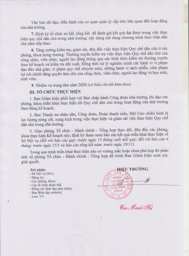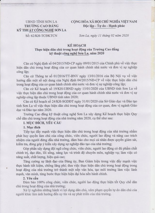 Kế hoạch thực hiện dân chủ năm 2020