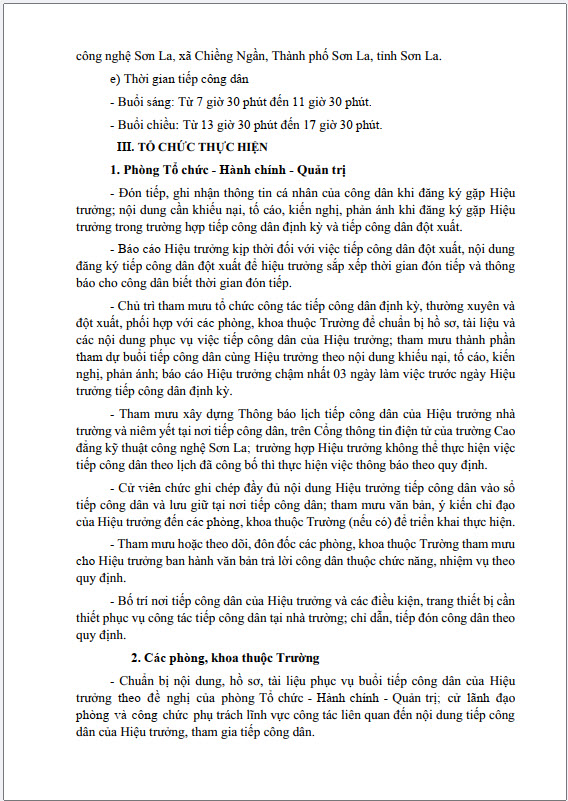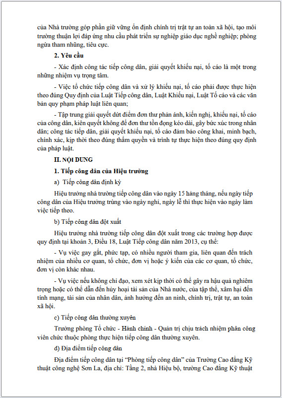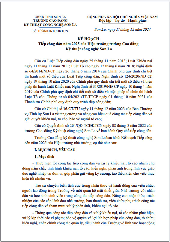 Kế hoạch tiếp công dân năm 2025 của Hiệu trưởng trường Cao đẳng Kỹ thuật công nghệ Sơn La