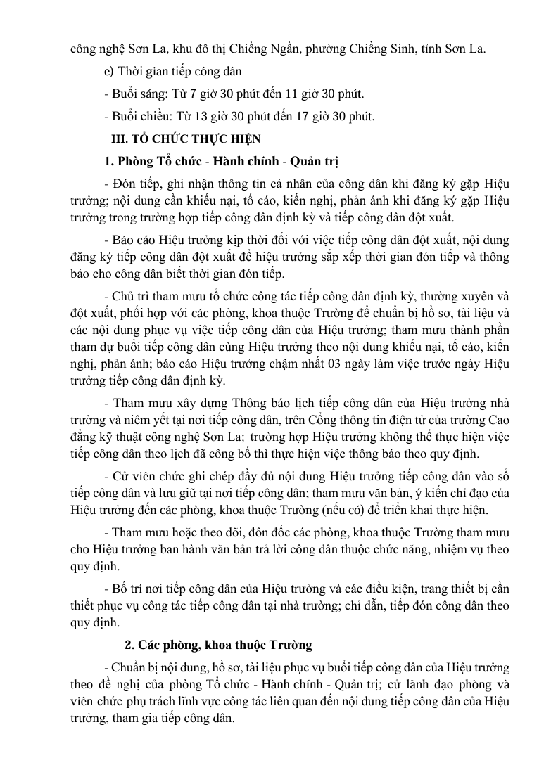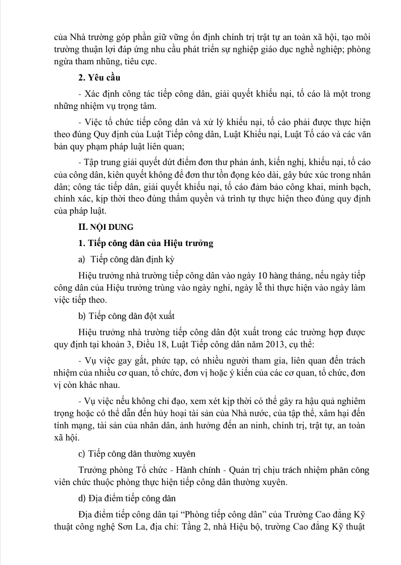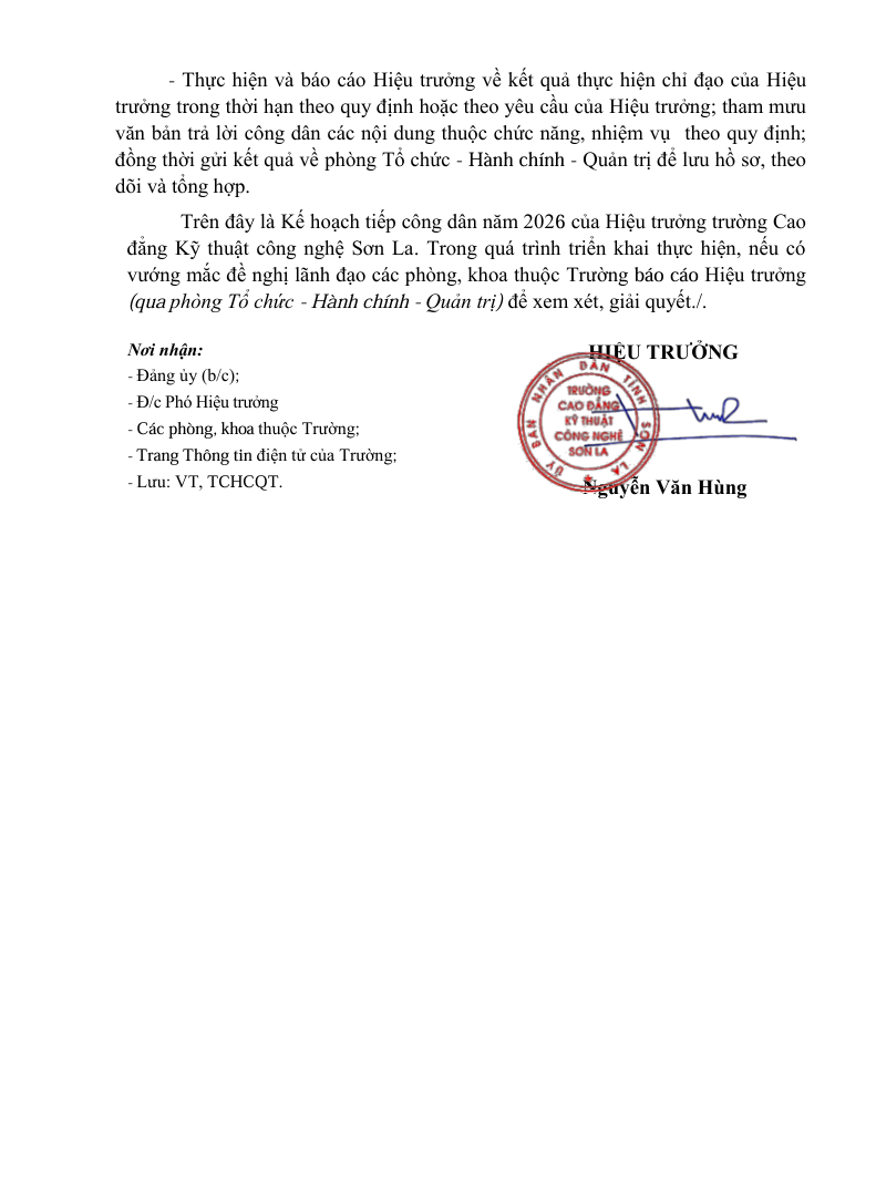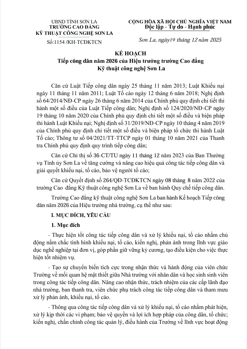 Kế hoạch tiếp công dân năm 2026 của trường Cao đẳng Kỹ thuật công nghệ Sơn La