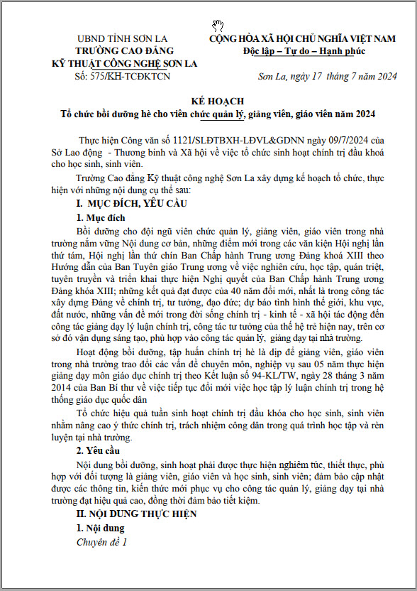 KẾ HOẠCH TỔ CHỨC BỒI DƯỠNG HÈ CHO VIÊN CHỨC QUẢN LÝ, GIẢNG VIÊN, GIÁO VIÊN NĂM 2024
