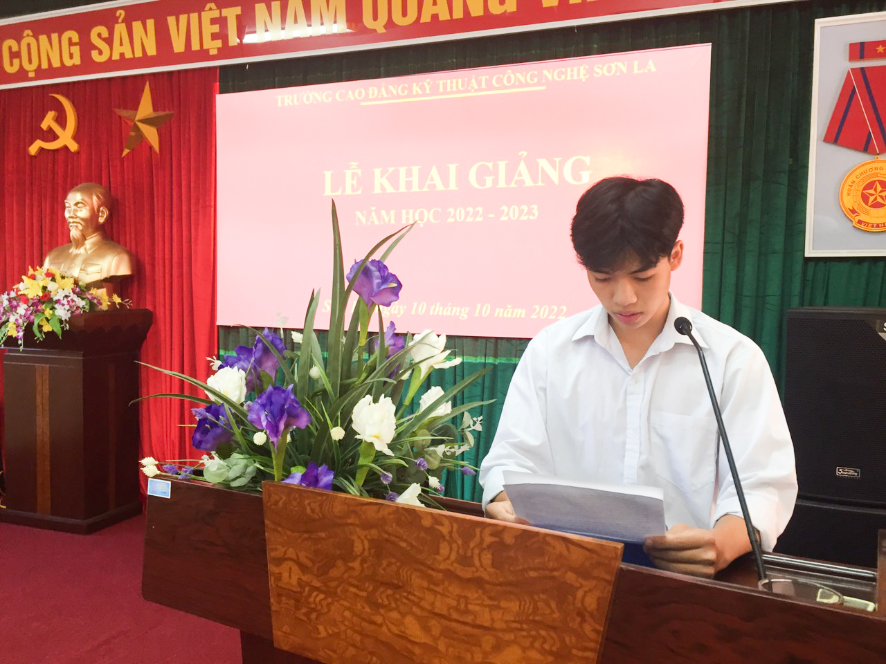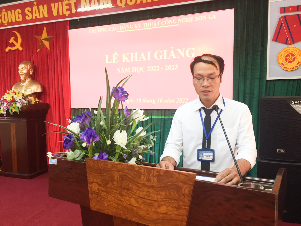 Thạc Sỹ Nguyễn Văn Hùng - Bí thư Đảng ủy, Hiệu trưởng nhà trường phát biểu khai giảng năm học 2022 - 2023 Phát biểu khai giảng năm học mới, đồng chí Nguyễn Văn Hùng - Bí thư Đảng ủy, Hiệu trưởng nhà trường đã biểu dương các kết quả mà nhà trường đạt được trong năm học qua và mong muốn nhà trường sẽ tiếp tục phát huy tinh thần trách nhiệm, khắc phục khó khăn, tạo mọi điều kiện thuận lợi, đồng hành với học sinh, sinh viên để hoàn thành xuất sắc nhiệm vụ năm học 2022 – 2023. Nhắn nhủ với tân học sinh, sinh viên, thầy Nguyễn Văn Hùngchia sẻ, trước mắt các em là chặng đường dài và sẽ có không ít khó khăn, vất vả. Các em hãy phát huy nhiệt huyết của tuổi trẻ, khắc phục khó khăn. Các em hãy say mê, sáng tạo trong học tập để có học vấn tinh thông, hình thành kỹ năng nghề nghiệp. Đồng thời, các em cần chủ động, tích cực tham gia các hoạt động rèn luyện, bồi dưỡng kỹ năng sống cho bản thân để thích ứng với môi trường làm việc có kỷ luật, cạnh tranh, năng động và hội nhập quốc tế. Thầy Nguyễn Văn Hùng đã khẳng định: “Nhà trường luôn đồng hành và tạo mọi điều kiện tốt nhất để các em trưởng thành”. Bước vào năm học mới, năm học 2022 - 2023, là năm học thứ 50 trong lịch sử xây dựng và phát triển của nhà trường, năm học mà nhà trường tiếp tục phấn đấu lập thành tích để viết tiếp những truyền thống tốt đẹp trong suốt những năm qua, tiếp tục khẳng định vị trí dẫn đầu ở các ngành kỹ thuật của lĩnh vực giáo dục nghề nghiệp trong toàn tỉnh và đặt nền móng vững chắc cho quá trình xây dựng Trường Cao đẳng Kỹ thuật công nghệ Sơn La là một trong những trường mạnh trong khu vực các tỉnh miền núi phía bắc.