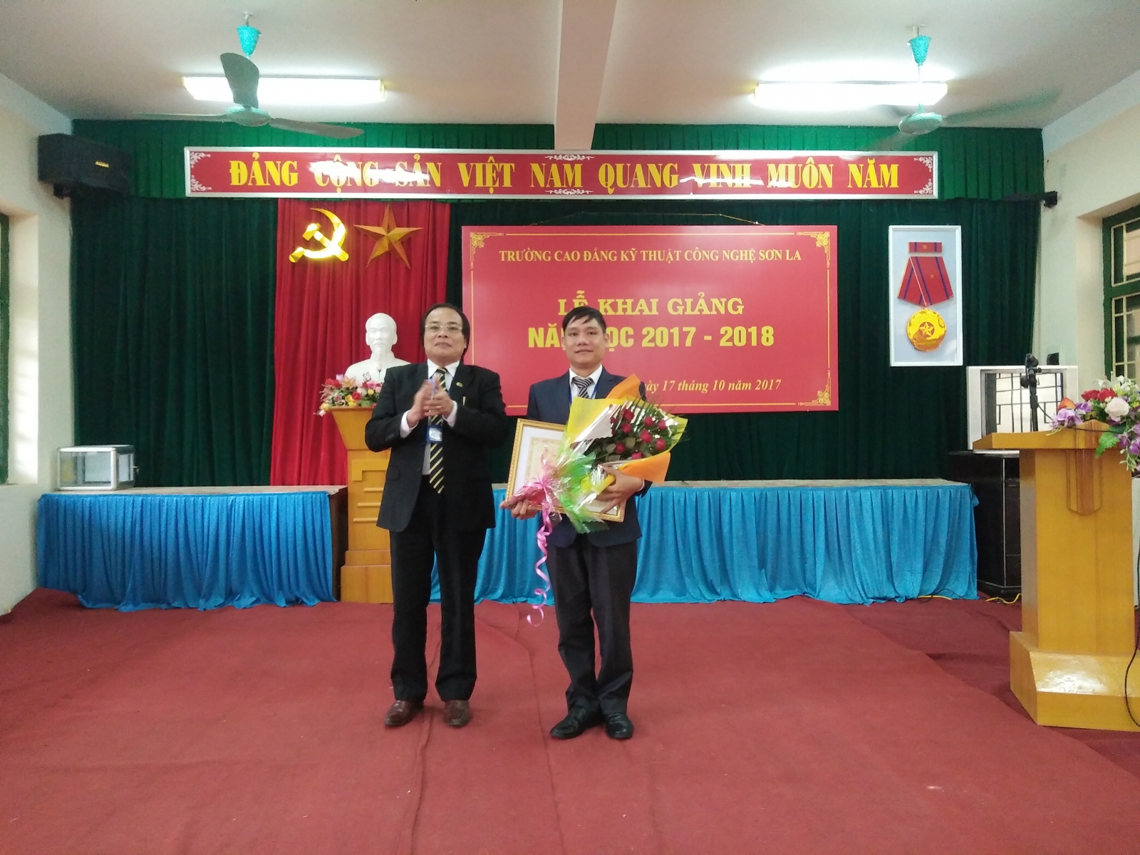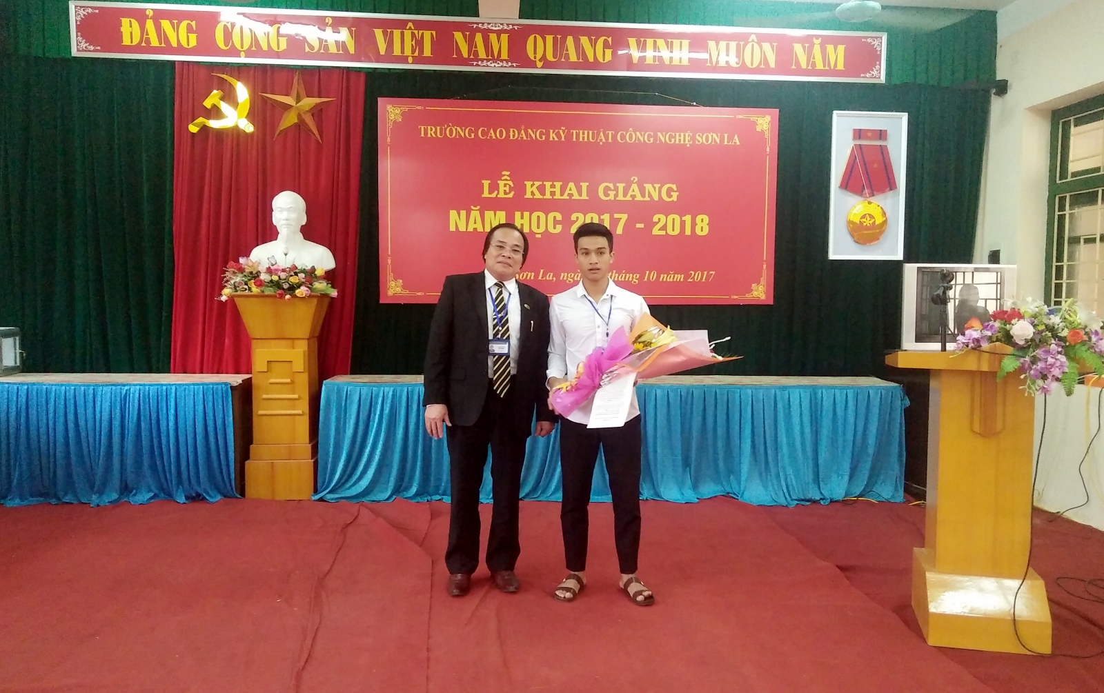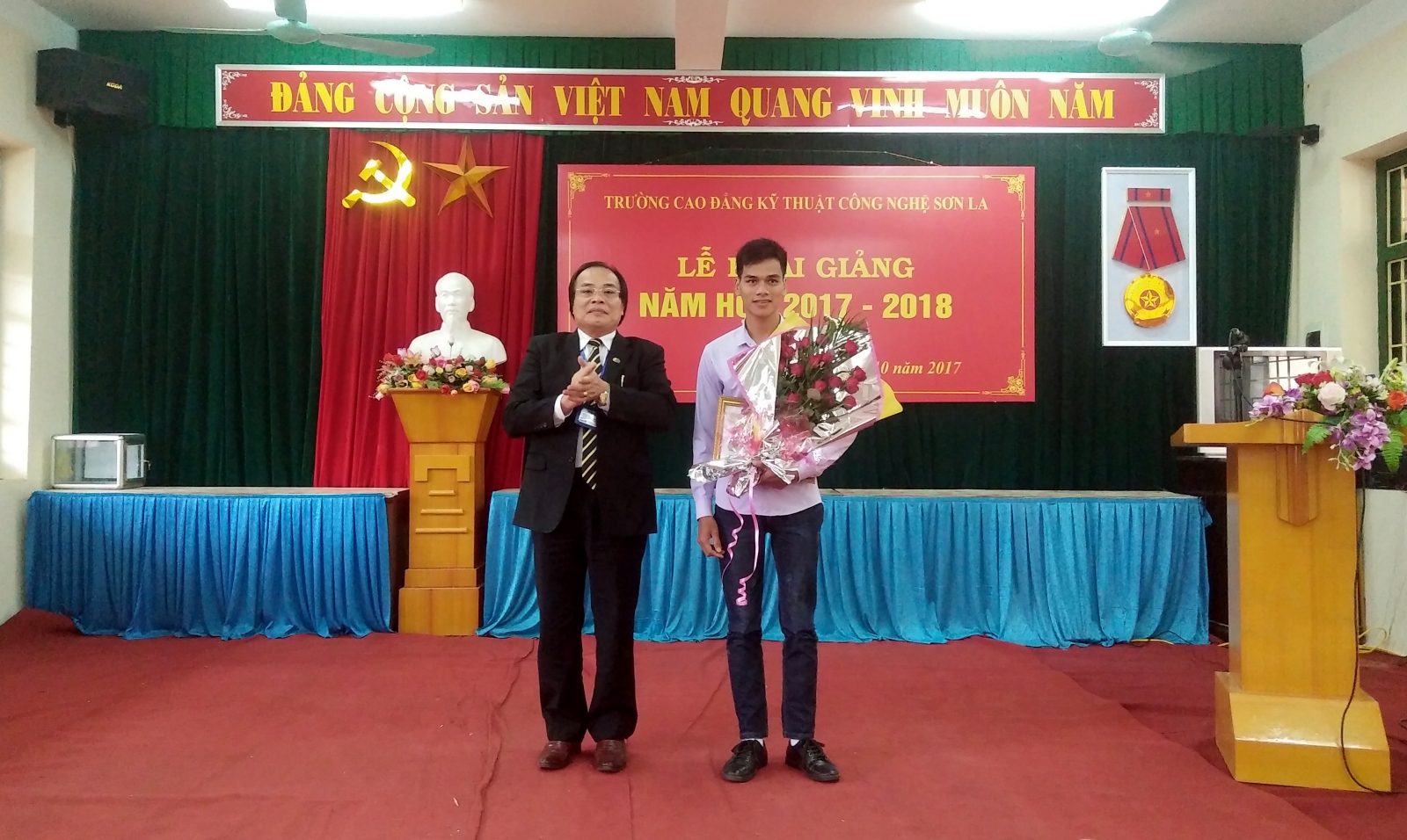 Sinh viên Lò Đại Dương - Lớp Cao đẳng Điện công nghiệp K4 phát biểu cảm tưởng và tặng hoa cho thầy Hiệu trưởng Sinh viên Lò Đại Dương thay mặt cho hơn 1.500 học sinh, sinh viên đang học tập tại trường và 11 trung tâm Giáo dục nghề nghiệp - Giáo dục thường xuyên các huyện, thành phố phát biểu cảm tưởng, đồng thời sinh viên Lò Đại Dương cũng thay mặt các tân học sinh, sinh viên hứa với nhà trường sẽ đoàn kết, phấn đấu học tập, rèn luyện, tu dưỡng thật tốt và luôn chấp hành mọi nội quy, quy chế mà nhà trường, khoa đề ra để không phụ lòng tin của thầy, cô và gia đình. Để ghi nhận sự cố gắng và nỗ lực của tập thể cán bộ, viên chức và nhân viên nhà trường Đ/c Cầm Ngọc Minh - Chủ tịch UBND tỉnh Sơn La đã tặng bằng khen cho thầy và trò nhà trường. Dưới đây là một số hình ảnh của buổi lễ Khai giảng.