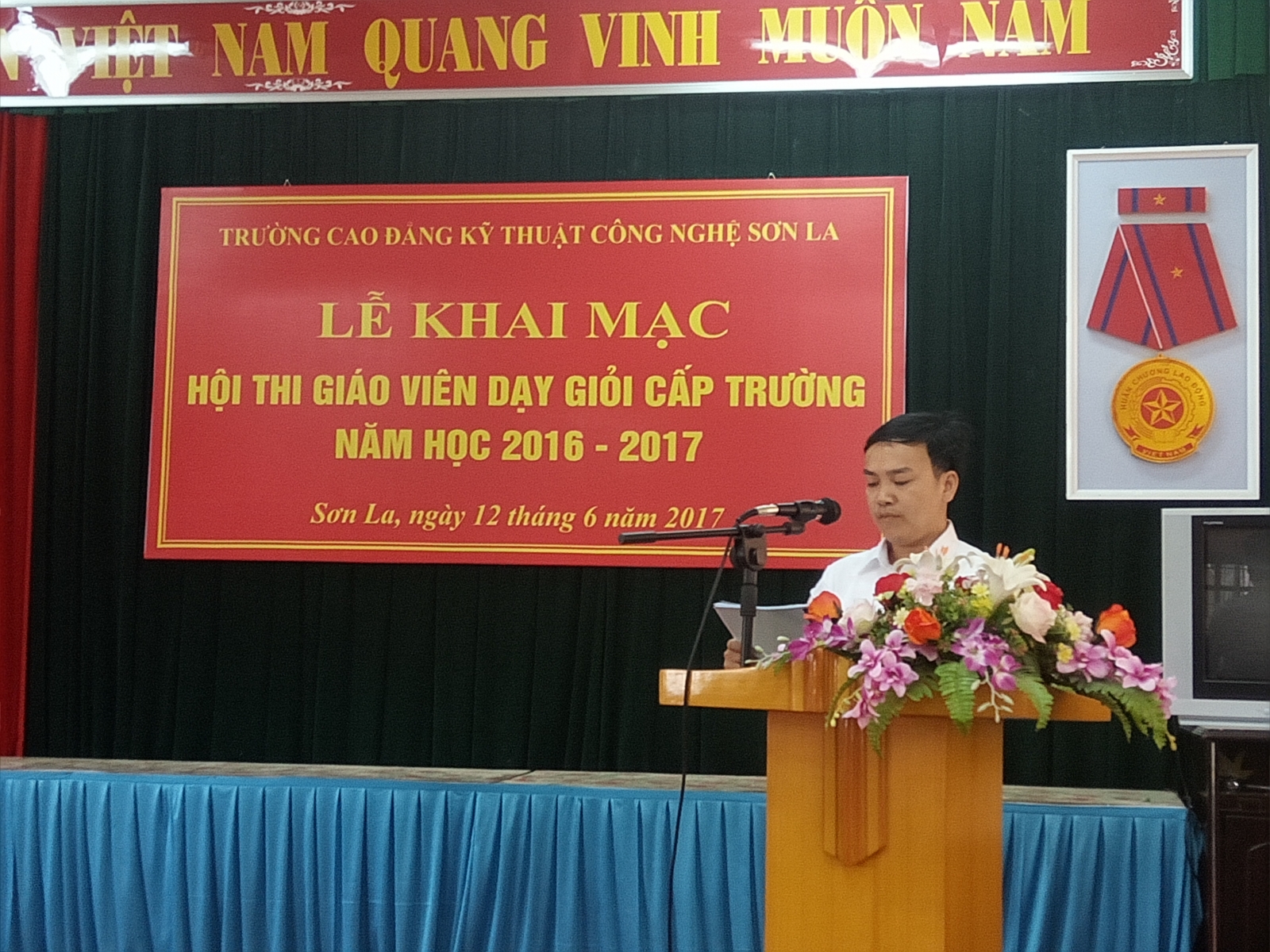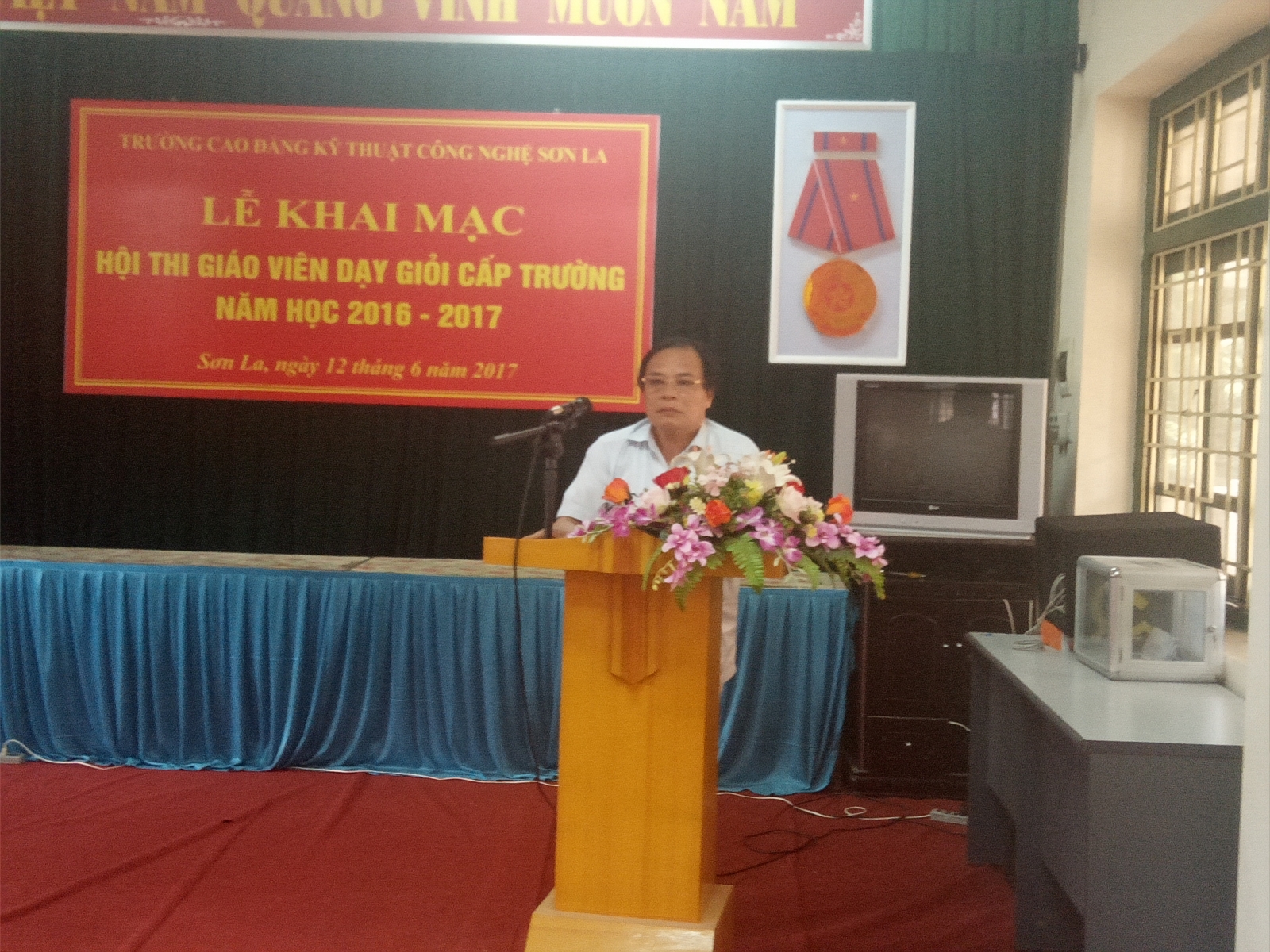 » Danh sách giáo viên, nhân viên tham gia lớp bồi dưỡng đánh giá kỹ năng nghề bậc 1 năm 2017 (08.06.2017 ) » Quyết định đổi tên trường Cao đẳng Nghề Sơn La thành Trường Cao đẳng Kỹ thuật công nghệ Sơn La (02.06.2017 ) » Ngày Pháp luật nước Cộng hòa xã hội chủ nghĩa Việt Nam (09.11.2015 ) » Thông báo tuyển dụng viên chức năm 2014 - 2015 (21.11.2014 ) » Thư chúc mừng Ngày Nhà giáo Việt Nam 20-11 (13.11.2014 ) » Kết quả tốt nghiệp các lớp khóa học 2012 - 2014 (10.11.2014 ) » Hướng dẫn thực hiện điều lệ đoàn (06.11.2014 ) » Điều lệ đoàn thanh niên cộng sản Hồ Chí Minh (06.11.2014 ) » Tài liệu tuyên truyền 45 năm thành lập Tổng cục dạy nghề (29.10.2014 ) » Lễ khai giảng năm học 2014 - 2015 (28.10.2014 ) Ngày 12/6/2017 Trường Cao đẳng Kỹ thuật Công nghệ Sơn La trọng tổ chức Khai mạc Hội thi "Giáo viên dạy giỏi cấp trường năm học 2016 - 2017”. Tham dự hội thi có 16 giảng viên, giáo viên xuất sắc lựa chọn của 08 khoa chuyên môn đại diện cho gần 70 giảng viên, giáo viên của nhà trường. Mục đích của hội thi là nhằm tạo điều kiện cho giảng viên, giáo viên viên được thể hiện năng lực sư phạm thông qua các bài trình giảng, được học tập, trao đổi kinh nghiệm về giảng dạy với đồng nghiệp, giúp cho các giảng viên, giáo viên nâng cao năng lực chuyên môn, đổi mới phương pháp dạy học; ứng dụng công nghệ thông tin trong giảng dạy; góp phần nâng cao chất lượng đào tạo trong nhà trường. Dự lễ khai mạc có các đồng chí trong BCH Đảng bộ, BGH, Ban giám khảo, đại diện các phòng, khoa chuyên môn đến dự và chúc mừng.