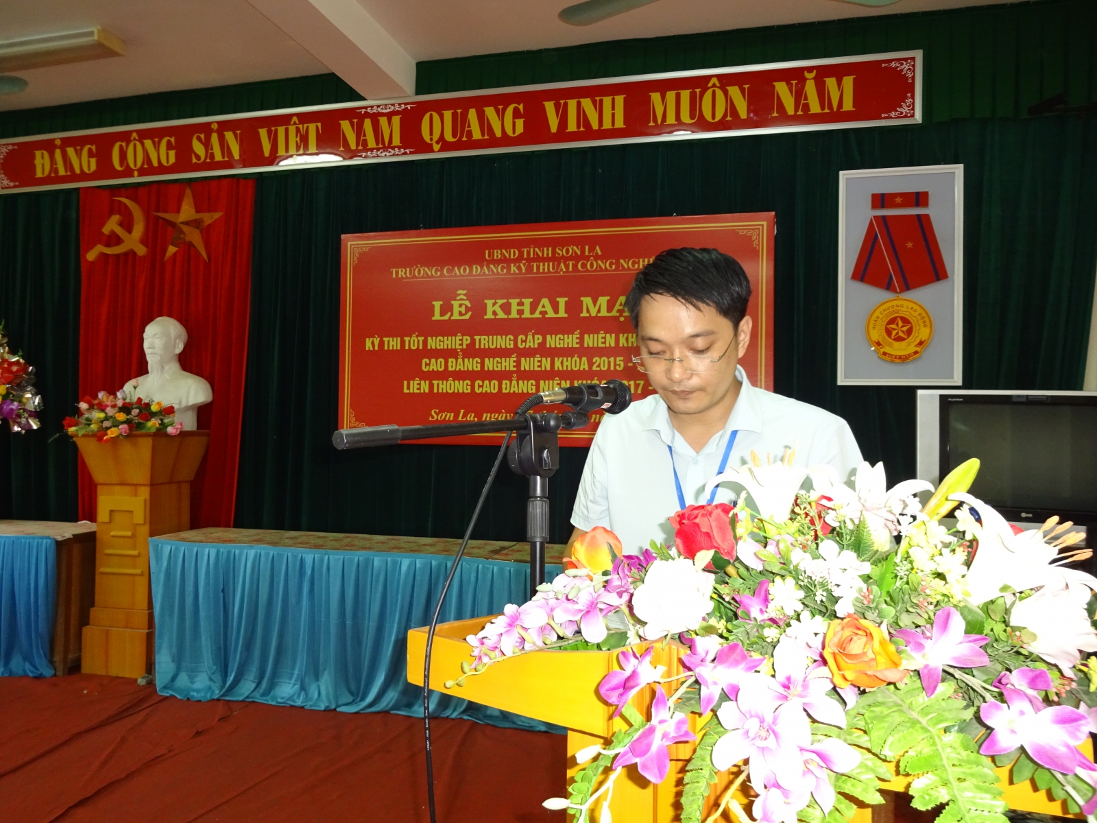 Đồng chí Cao Minh Hà - phát biểu chỉ đạo kỳ thi Phát biểu tại buổi lễ khai mạc, đồng chí Cao Minh Hà - Hiệu trưởng Nhà trường đã nhấn mạnh rằng: Thi tốt nghiệp là một khâu quan trọng trong quá trình đào tạo, thông qua kỳ thi nhằm đánh giá toàn diện kết quả học tập và rèn luyện của mỗi học sinh, sinh viên theo mục tiêu, yêu cầu đào tạo; làm cơ sở để xét, công nhận và cấp bằng tốt nghiệp cho học sinh, sinh viên các khoá đào tạo chính quy tại nhà trường. Đồng thời, thông qua kết quả thi tốt nghiệp, Nhà trường có thêm cơ sở để đánh giá chất lượng, phát triển toàn diện công tác đào tạo; kịp thời khắc phục những hạn chế, bất cập về chương trình, nội dung, phương pháp giảng dạy, học tập để nâng cao một bước về chất lượng đào tạo. Thay mặt Hội đồng thi Thầy Cao Minh Hà yêu cầu các thành viên hội đồng thi, Ban giám khảo và học sinh, sinh viên tham dự kỳ thi tốt nghiệp hệ Cao đẳng Cao đẳng liên thông và Trung cấp nghề năm 2018 thực hiện nghiêm túc quy chế thi, cố gắng hết mình, bình tĩnh, tự tin để hoàn thành phần thi với kết quả tốt nhất và chúc các em học sinh, sinh viên thành công và sớm tìm được việc làm như mong muốn sau khi tốt nghiệp. Thực hiện sự phân công của Hội đồng thi: Thầy giáo Bùi Xuân Tiến - Trưởng phòng Khảo thí, ĐBCL và Công tác HSSV lên đọc các Quyết định thành lập Hội đồng thi, Ban coi thi, chấm thi.