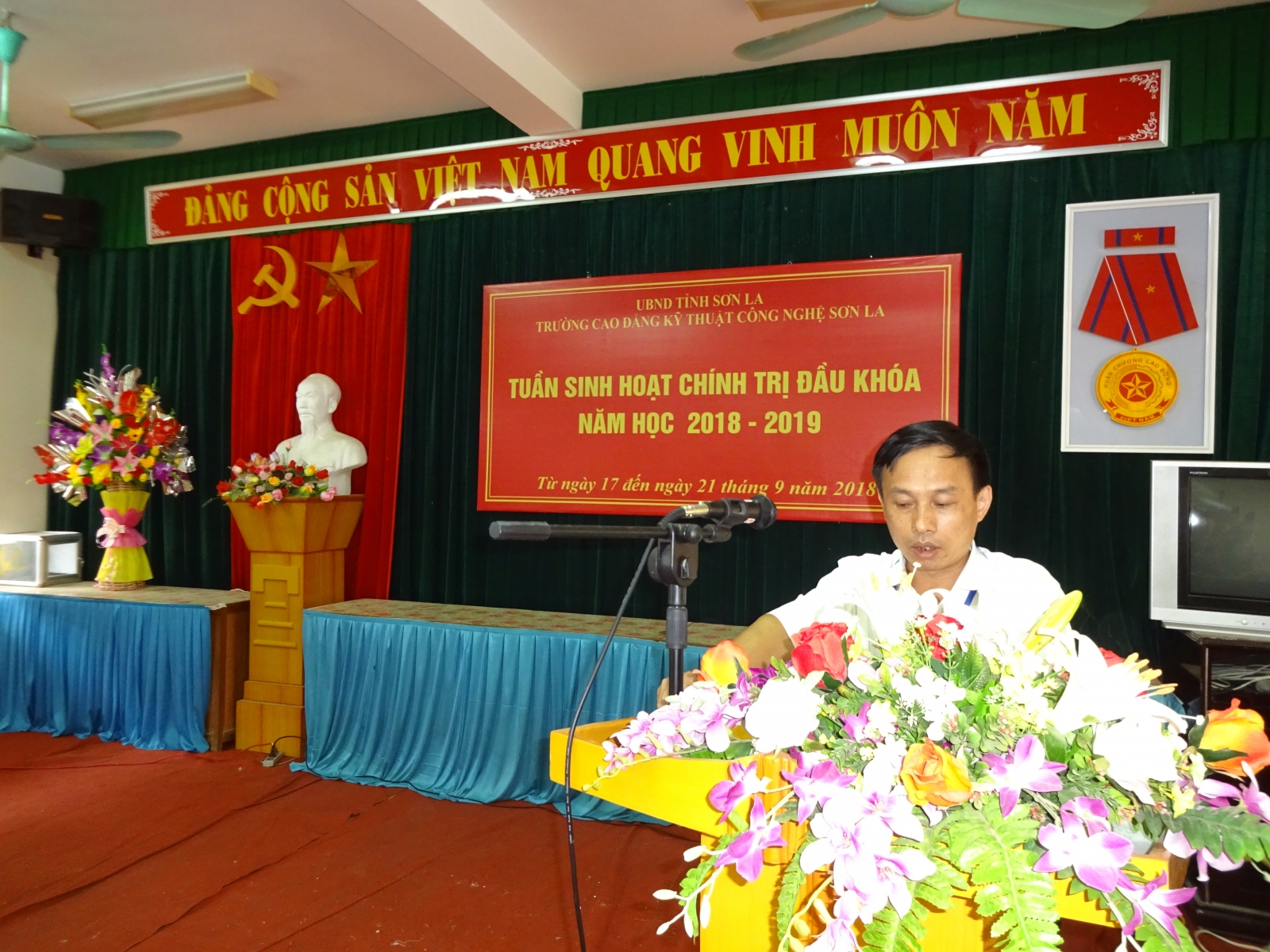 Đồng chí Nguyễn Quốc Quang - phát biểu chỉ đạo Tuần học chính trị đầu khóa bắt đầu từ ngày 17/9/2018 và kết thúc vào ngày 21/9/2018. Đây là hoạt động nhằm giúp các em tân học sinh, sinh viên nâng cao nhận thức về đường lối, chủ trương của Đảng, chính sách pháp luật của Nhà nước, hiểu rõ và vận dụng các qui chế, qui định đào tạo, rèn luyện của BLĐTBXH và của trường Cao đẳng kỹ thuật công nghệ Sơn La; trang bị một số thông tin cơ bản, cần thiết về Giúp HS,SV hiểu được mục tiêu, nội dung của Công tác phòng chống tội phạm và các tệ nạn xã hội, công tác bảo đảm ANTT chính trị, trật tự trong trường học và các nội dung về Phổ biến, giáo dục pháp luật về ATGT và các văn bản có liên quan đến ATGT, các hoạt động Đoàn, Hội… và Nâng cao nhận thức của HSSV về chủ trương, đường lối của Đảng, chính sách, pháp luật của Nhà nước. Đồng thời giúp các tân học sinh, sinh viên hiểu rõ quyền lợi, nghĩa vụ, ý thức trách nhiệm của mình - HSSV thông qua việc tuyên truyền, phổ biến pháp luật, các quy chế về đào tạo, chế độ chính sách đối với HSSV; Phương hướng, nhiệm vụ năm học 2018 - 2019, nhiệm vụ của người học nhằm đáp ứng tốt yêu cầu đào tạo, rèn luyện và trang bị các kiến thức, kỹ năng sống, kỹ năng nghề nhằm đáp ứng tốt nhu cầu xã hội.