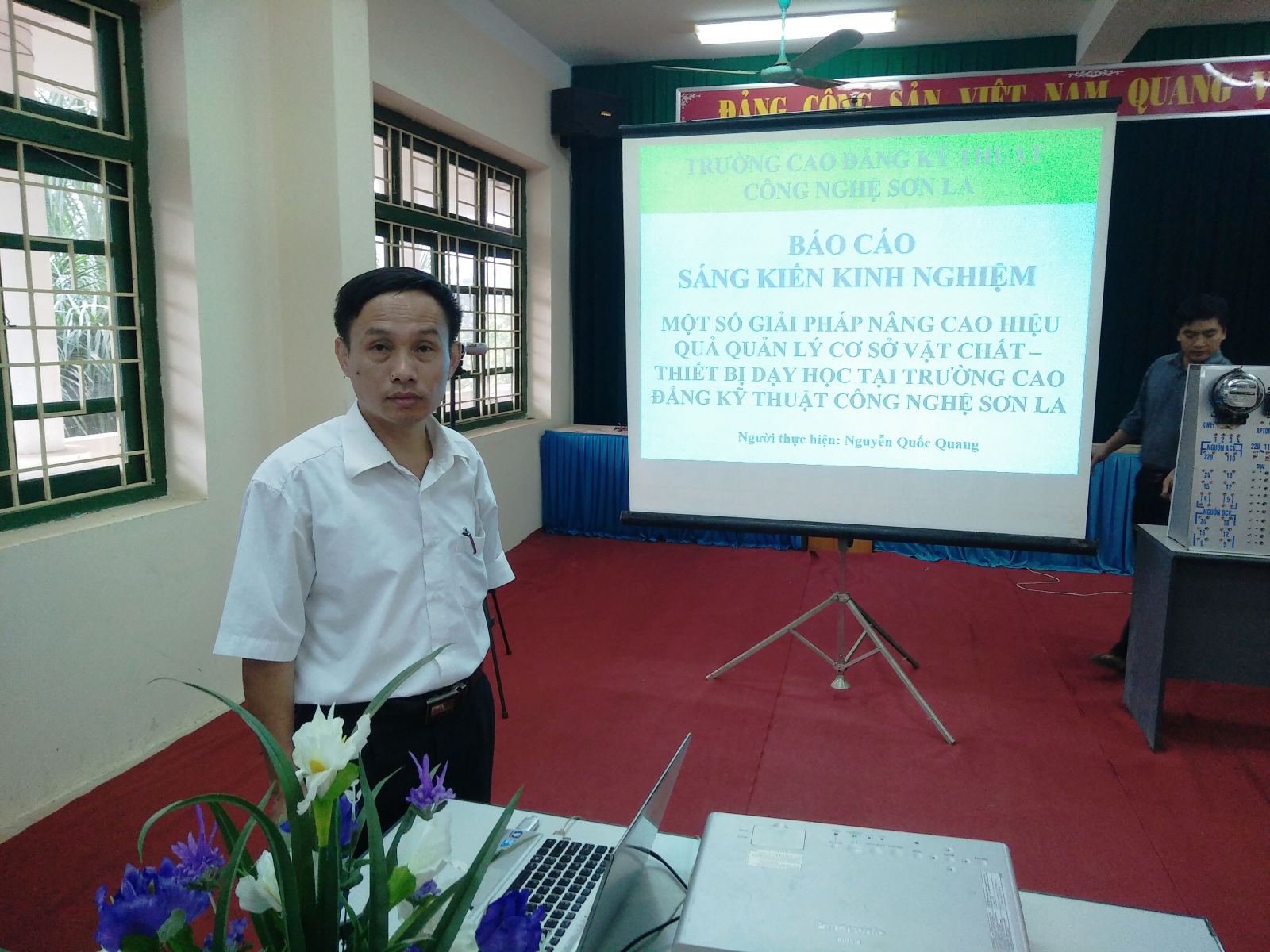 Hội đồng nghiệm thu đề tài cấp cơ sở Những đề tài nghiệm thu lần này có nội dung đa dạng, phong phú, quá trình thực hiện rất công phu, chuyên nghiệp thể hiện sự đầu tư nghiên cứu, tìm tòi rất nghiêm túc của các tác giả và nhóm tác giả. Tại buổi nghiệm thu, các tác giả và nhóm tác giả tham gia nghiên cứu khoa học đã trình bày tóm tắt nội dung đề tài, sáng kiến kinh nghiệm của mình. 1. Ths. Nguyễn Quốc Quang: Với sáng kiến kinh nghiệm “Một số giải pháp nâng cao hiệu quả quản lý cơ sở vật chất - trang thiết bị dạy học ở Trường Cao đẳng Kỹ thuật Công nghệ Sơn La”