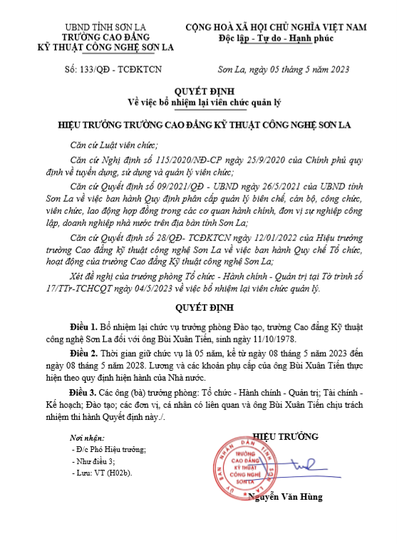 » Quyết định 134 về việc bổ nhiệm lại viên chức quản lý (10.05.2023)