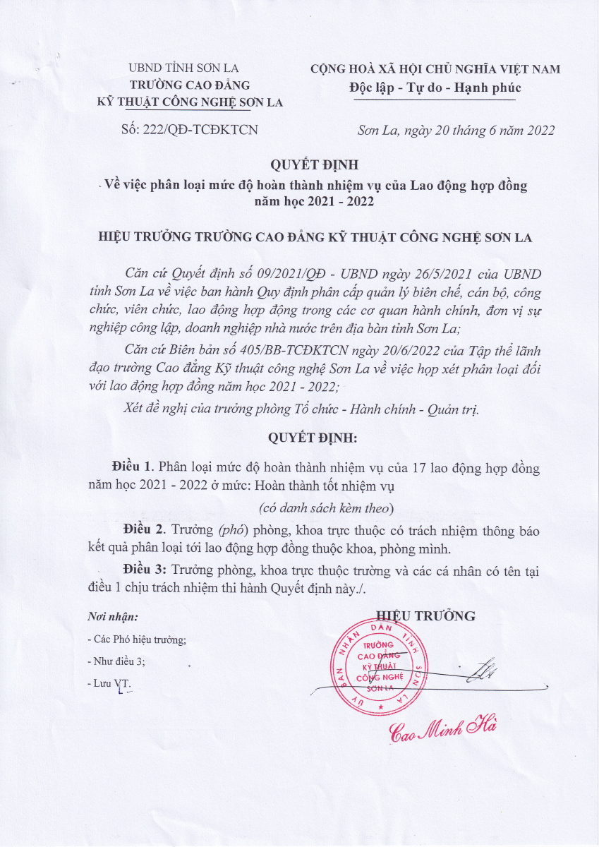 Quyết định số 222/QĐ-TCĐKTCN về việc phân loại mức độ hoàn thành nhiệm vụ của lao động hợp đồng năm học 2021-2022