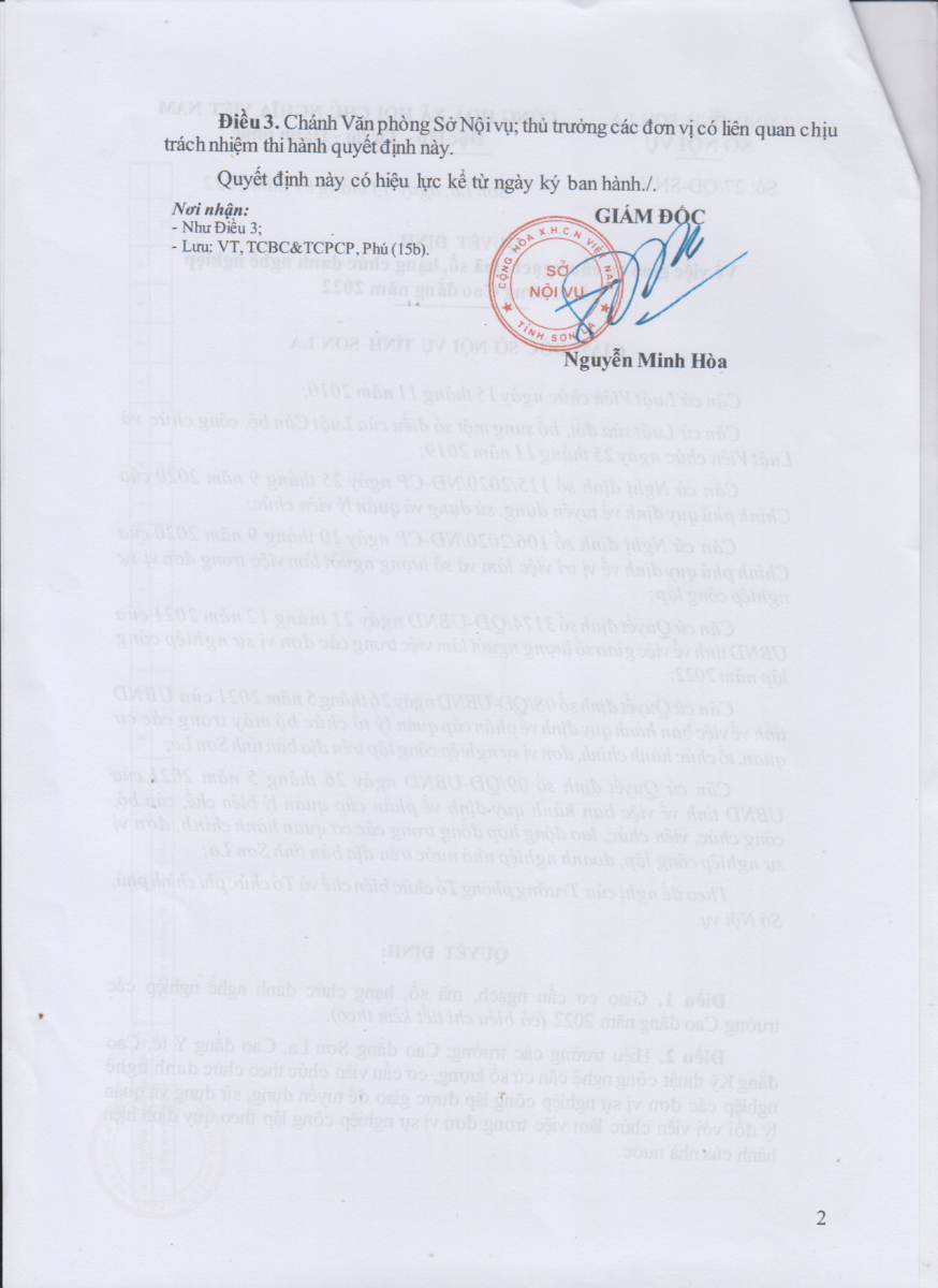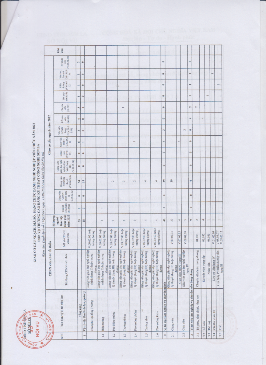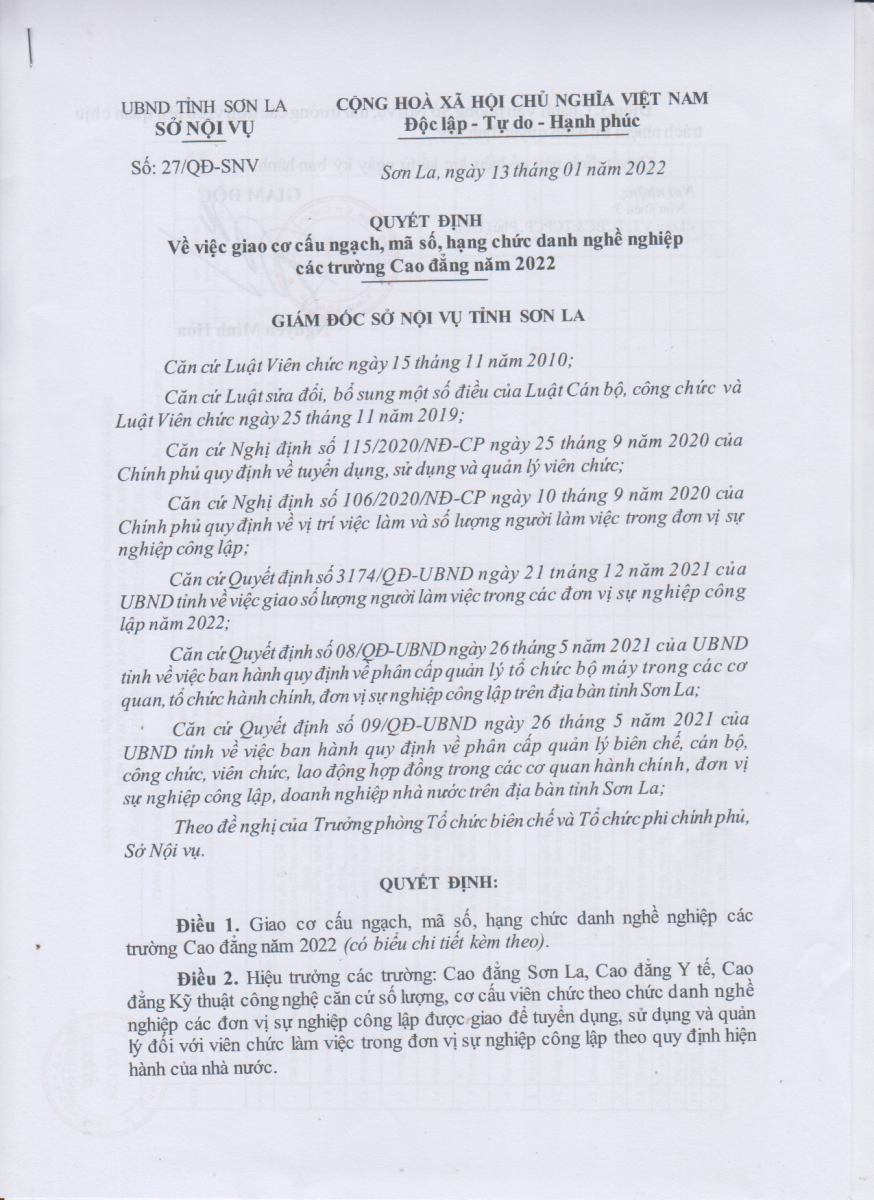 Quyết định số 27/QĐ-SNV ngày 13/01/2022 về việc giao cơ cấu ngạch, mã số, hạng chức danh nghề nghiệp cho Trường Cao đẳng kỹ thuật công nghệ Sơn La năm 2022