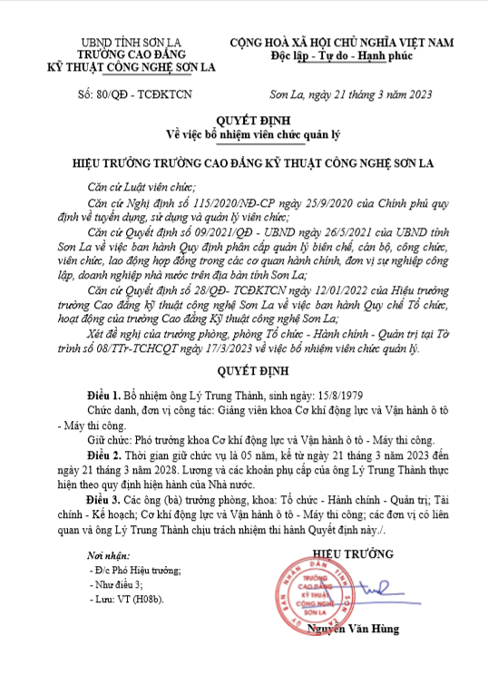 Quyết định số 80 về việc bổ nhiệm lại viên chức quản lý đối với ông Lý Trung Thành.