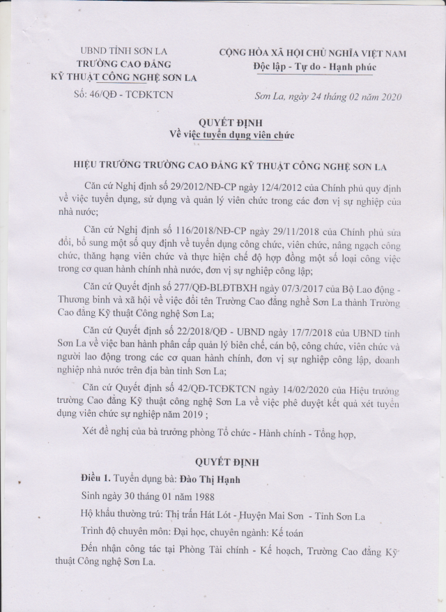 » Thông báo kết quả trúng tuyển viên chức năm 2019 (17.03.2020 ) » Kế hoạch thực hiện dân chủ năm 2020 (18.02.2020 ) » Thông báo tuyển dụng viên chức năm 2019 (28.11.2019 ) » Kế hoạch thi tốt nghiệp năm học 2018 - 2019 (16.08.2019 ) » Tuyên truyền và lấy ý kiến góp ý dự thảo Bộ Luật lao động (sửa đổi) (02.08.2019 ) » Thông báo tuyển sinh năm học 2019 - 2020 (04.05.2019 ) » Kết quả tốt nghiệp, hệ trung cầp nghề kỹ thuật xây dựng K37 (03.05.2019 ) » Chính sách chất lượng của Trường Cao đẳng Kỹ thuật công nghệ Sơn La (21.12.2018 ) » Phiếu đăng ký xét tuyển năm 2018 (07.07.2018 ) » Thông báo tuyển sinh năm học 2018 - 2019 (06.06.2018 )