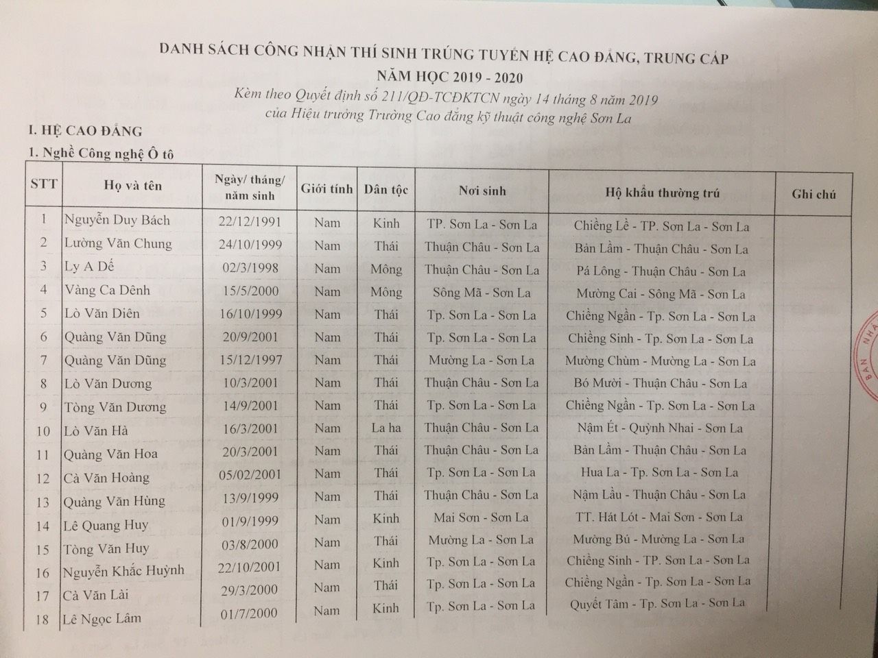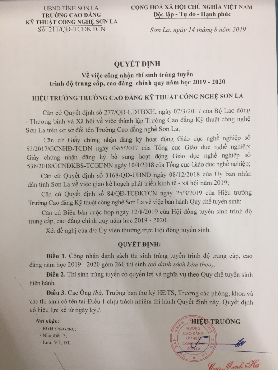 Quyết định và danh sách thí sinh trúng tuyển trình độ cao đẳng, trung cấp năm học 2019 - 2020