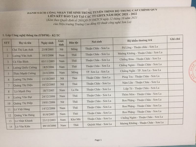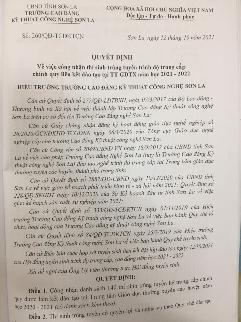 Quyết định và danh sách trúng tuyển các lớp liên kết đào tạo năm học 2021 - 2022