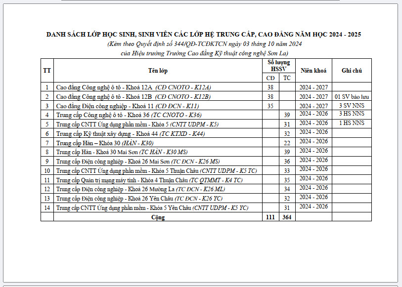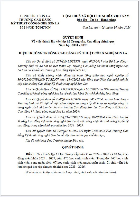 Quyết định về việc thành lập các lớp Trung cấp, Cao đẳng chính quy năm học 2024 - 2025