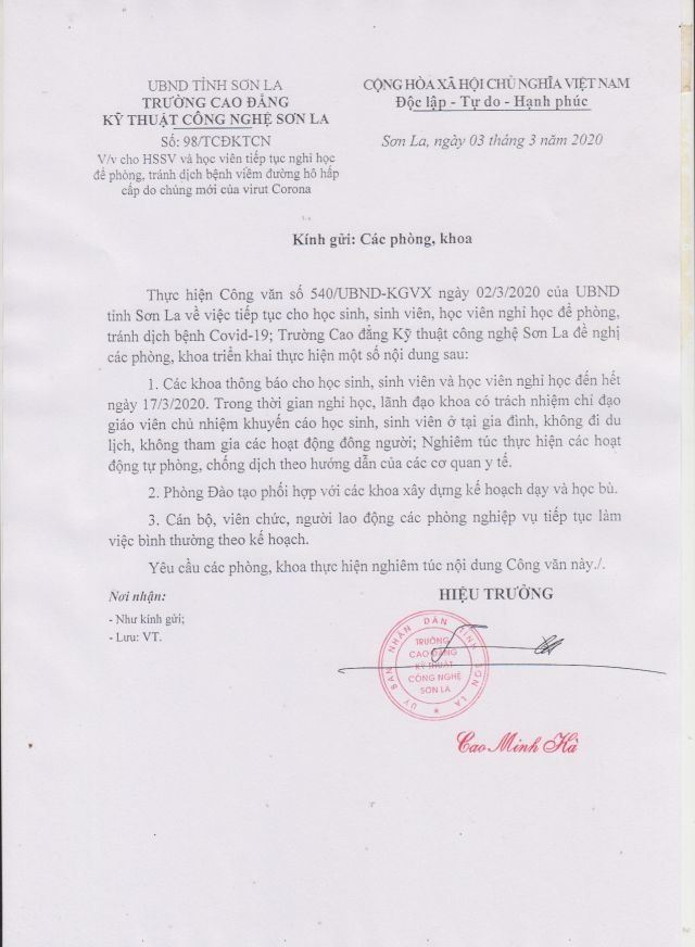 Thông báo nghỉ học để phòng, tránh dịch bệnh viêm đường hô hấp cấp