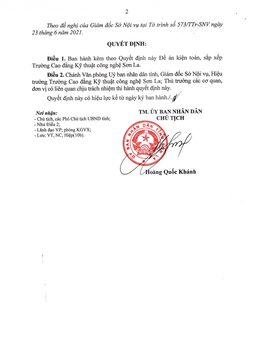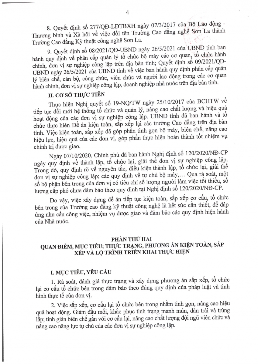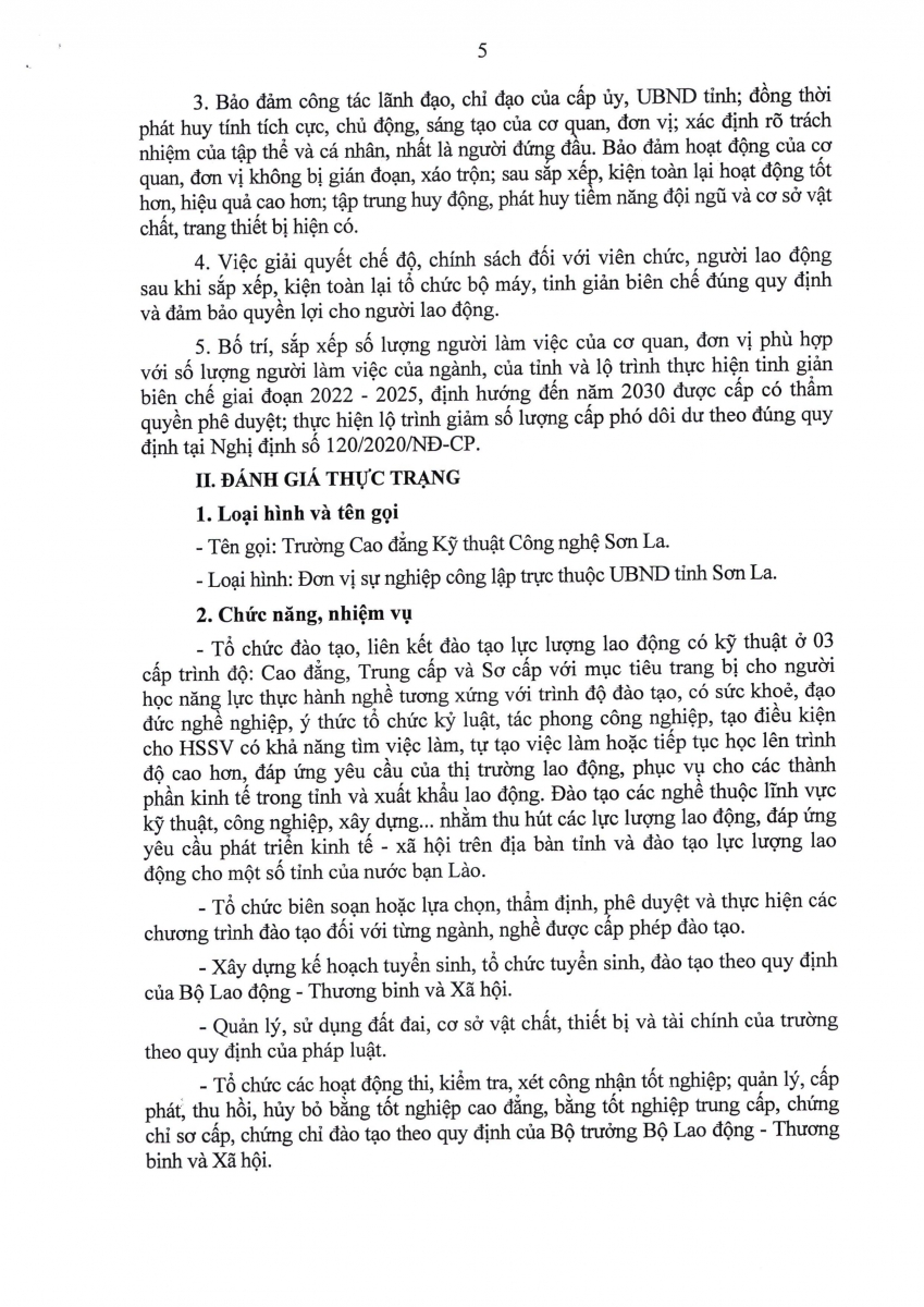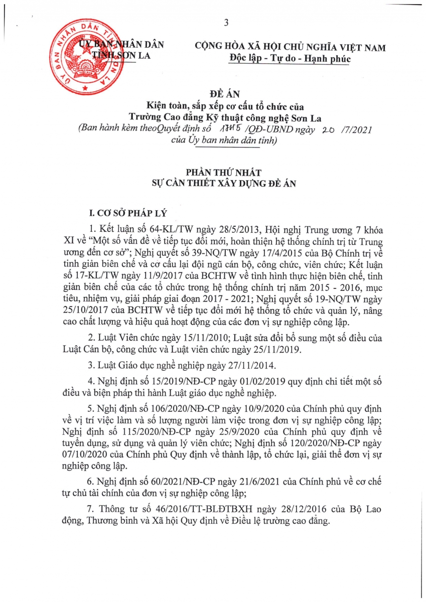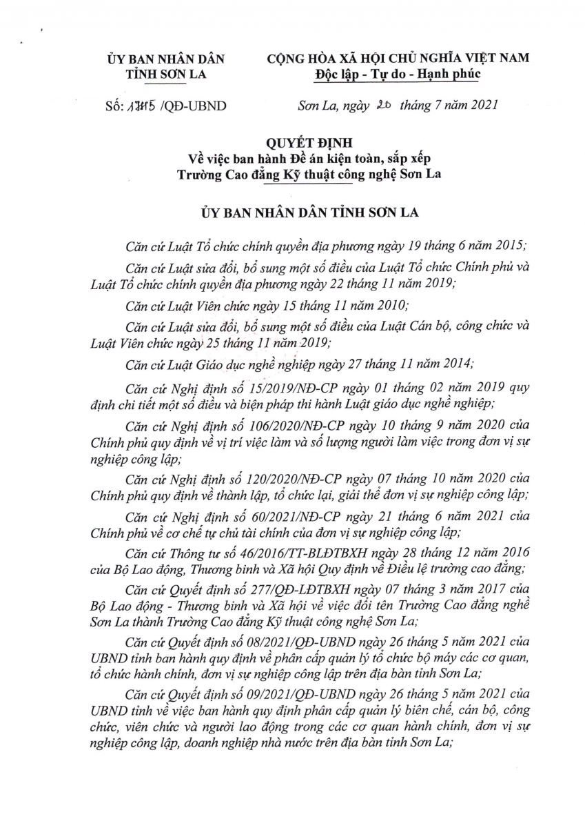 Thông báo Quyết định sô 1745/QĐ-UBND ngày 20/7/2021về việc ban hành Đề án kiện toàn, sắp xếp Trường cao đẳng kỹ thuật công nghệ Sơn La