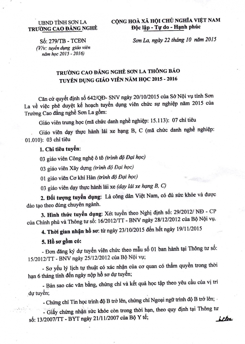 Thông báo tuyển dụng giáo viên năm học 2015 - 2016