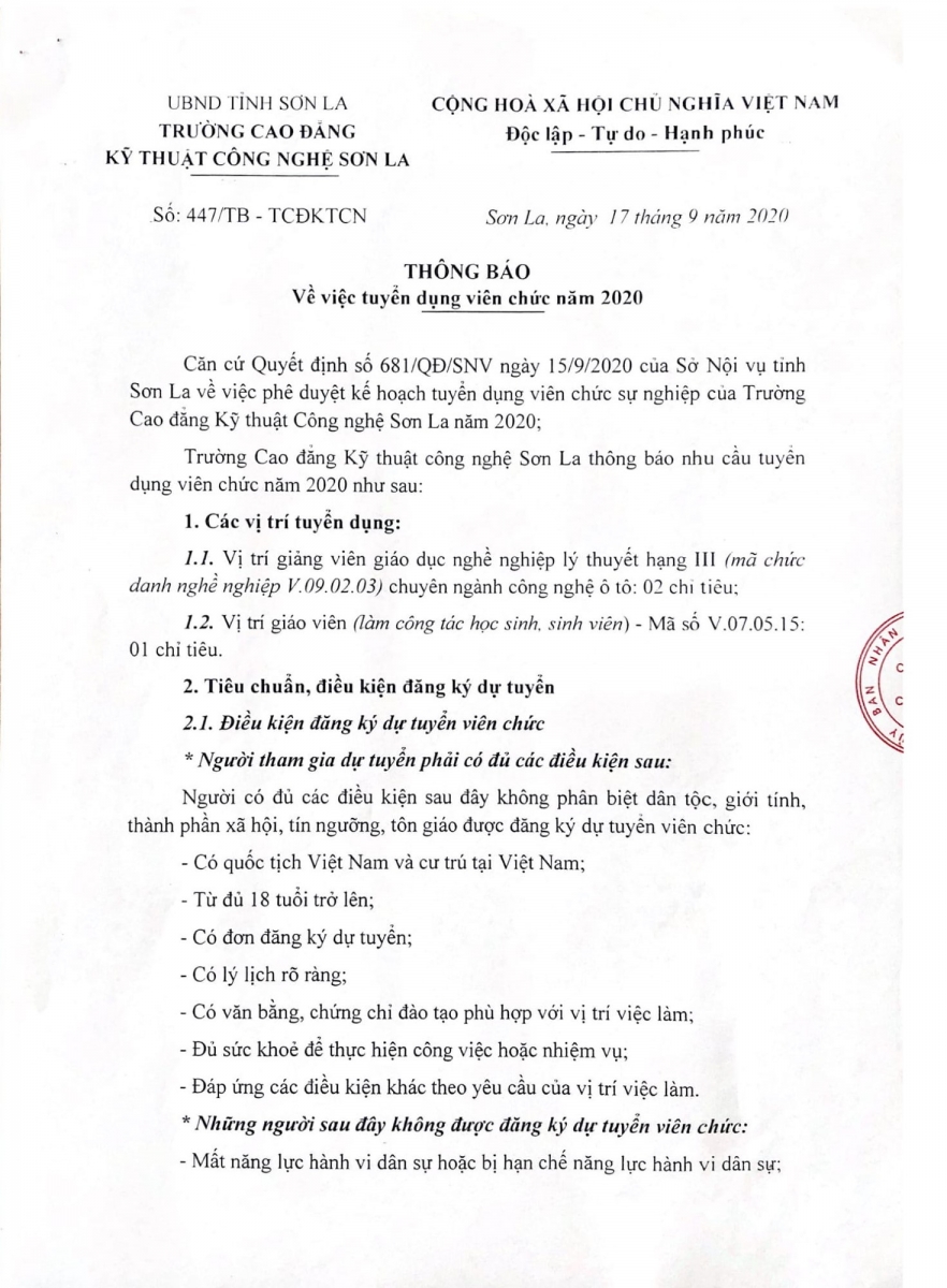 Thông báo tuyển dụng viên chức năm 2020