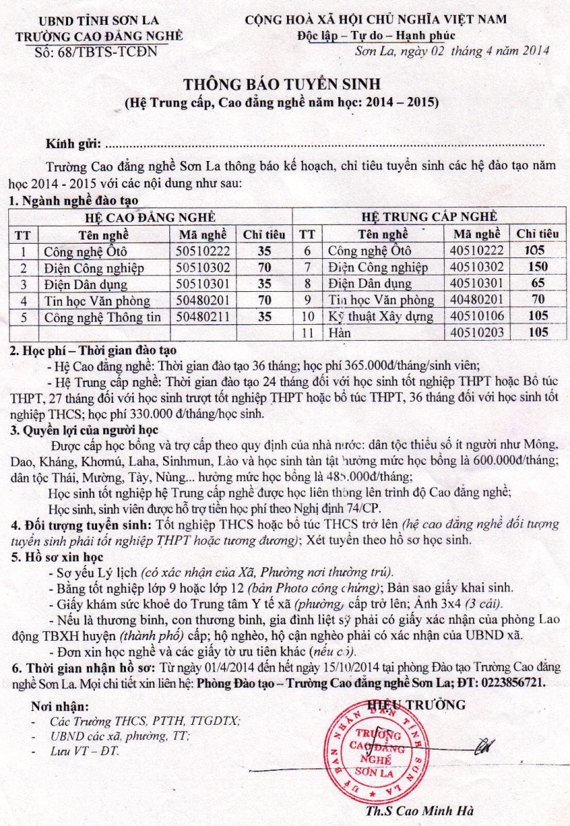 » Danh sách thí sinh đủ điều kiện dự tuyển viên chức năm học 2013-2014 (29.10.2013 ) » Thông báo kế hoạch tổ chức hội thi GVDG cấp trường năm học 2012 - 2013 (21.05.2013 ) » Quyết định công nhận tốt nghiệp lớp Máy thi công K13 (17.05.2013 ) » Quyết định công nhận tốt nghiệp các lớp Kỹ thuật Xây dựng năm học 2012 - 2013 (17.05.2013 ) » Thông báo nhập học lớp lái xe hạng B2 K60 (16.05.2013 ) » Thông báo nhập học lớp lái xe hạng C K78 (16.05.2013 ) » Thông báo tuyển sinh năm học 2013 - 2014 (14.03.2013 ) » Tuyển sinh năm 2012 - 2013 (27.04.2012 ) » Khoa CNTT triển khai CV số 01 của Trường TCN Sơn la (11.01.2012 ) » Thông báo nhập học lớp xe tải hạng C_Khóa 70 (16.08.2011 )