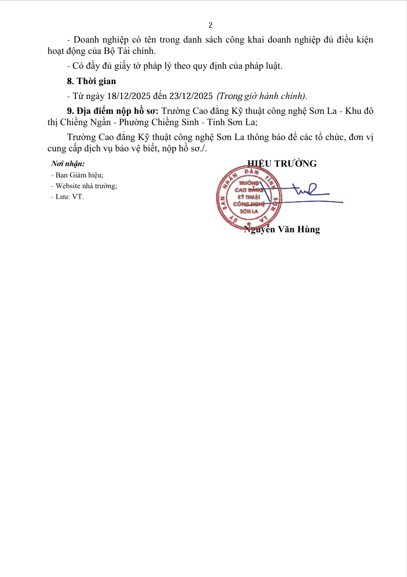 Thông báo về việc lựa chọn đơn vị cung cấp dịch vụ bảo vệ tại trường Cao đẳng Kỹ thuật công nghệ năm 2026