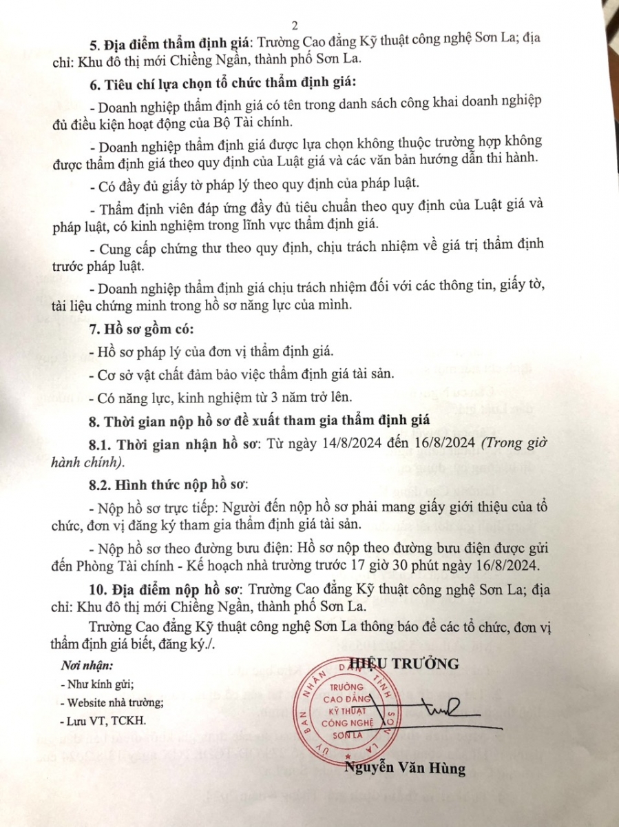 Thông báo Về việc lựa chọn tổ chức, đơn vị thực hiện thẩm định giá tài sản hư hỏng, hết khấu hao sử dụng của Trường Cao đẳng Kỹ thuật công nghệ Sơn La