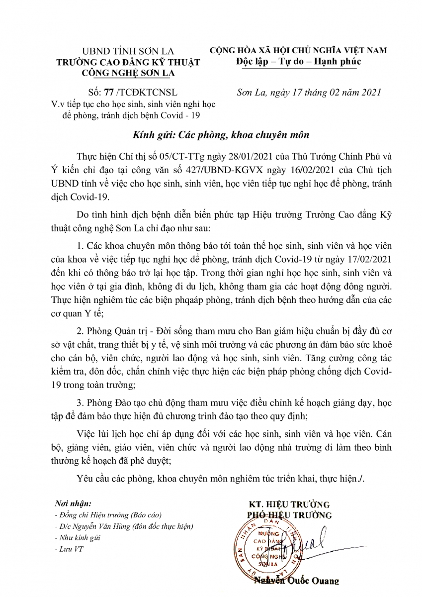 Thông báo về việc tiếp tục cho học sinh, sinh viên và học viên nghỉ học phòng tránh dịch bênh Covi-19