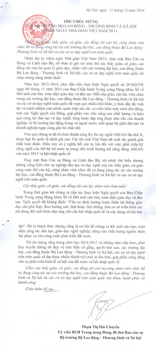 Thư chúc mừng Ngày Nhà giáo Việt Nam 20-11