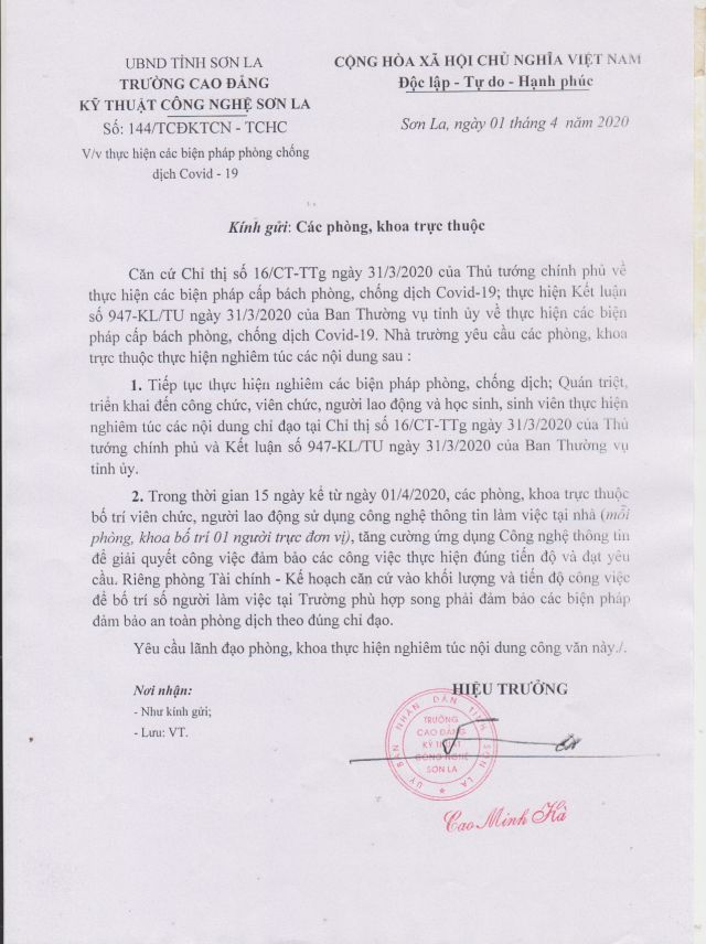 » Thông báo về việc tiếp tục cho học viên, học sinh, sinh viên nghỉ học để phòng, chống dịch Covid-19 (26.03.2020 ) » Quyết định trúng tuyển viên chức (17.03.2020 ) » Thông báo kết quả trúng tuyển viên chức năm 2019 (17.03.2020 ) » Kế hoạch thực hiện dân chủ năm 2020 (18.02.2020 ) » Thông báo tuyển dụng viên chức năm 2019 (28.11.2019 ) » Kế hoạch thi tốt nghiệp năm học 2018 - 2019 (16.08.2019 ) » Tuyên truyền và lấy ý kiến góp ý dự thảo Bộ Luật lao động (sửa đổi) (02.08.2019 ) » Thông báo tuyển sinh năm học 2019 - 2020 (04.05.2019 ) » Kết quả tốt nghiệp, hệ trung cầp nghề kỹ thuật xây dựng K37 (03.05.2019 ) » Chính sách chất lượng của Trường Cao đẳng Kỹ thuật công nghệ Sơn La (21.12.2018 )